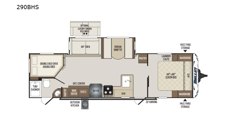 Whether you're spending your time soaking up the sun at the edge of the lake or trekking into the forest on a hunt for fresh berries, the Keystone Bullet travel trailer will not only get you to your destination, but it will also keep you happy while you're there. With the most luxury features of any other ultra lite trailer, like the exterior speakers, laundry chute, and LED lighting, the Bullet continues to provide the number one ultra lite travel trailer in America. Because of the contoured shape of the radius front profile on the Bullet, it offers less wind resistance as you tow it along the highway, and when you combine that with the extremely lightweight floor plan design, you get one unit that will help you cut costs when spending money on fuel.