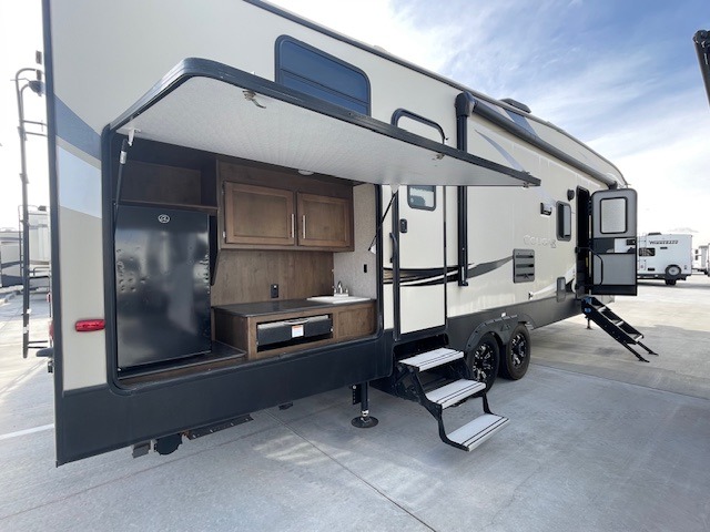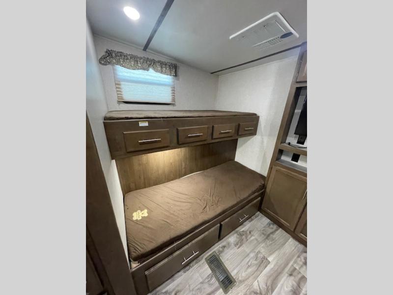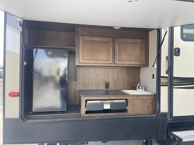 Owning a fifth wheel with a private bunkhouse is like carrying your home with you everywhere you go. This Cougar Half-Ton gives the kids their own space in the rear bunkhouse with two bunk beds while you have your own master bedroom on the opposite side of the RV. There is a slide out in each of the bedrooms and two slides in the main living and kitchen area allowing for more interior space for all. The inside cook will enjoy the extra counter space provided by the kitchen island including the sink, plus there are two pantries near by. The outdoor chef is sure to love the capital grill and mini refrigerator outside. Load up the family and enjoy the great outdoors together with inside comforts for everyone!