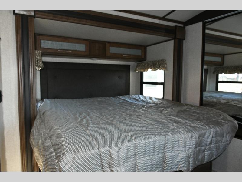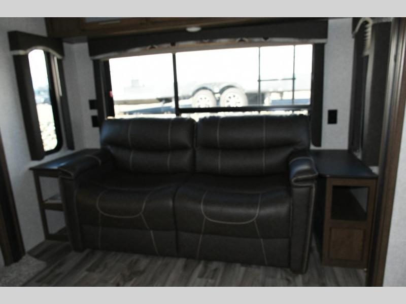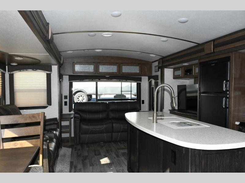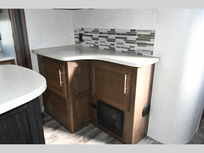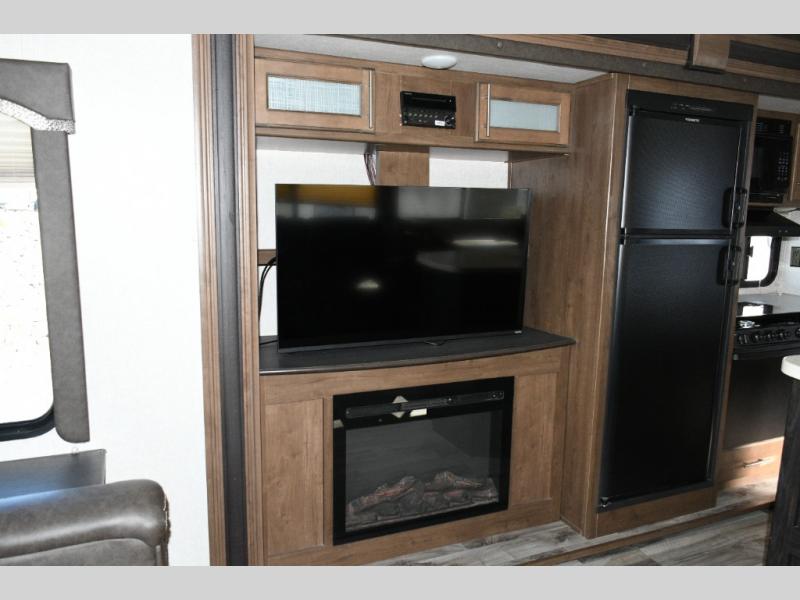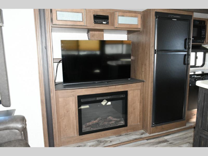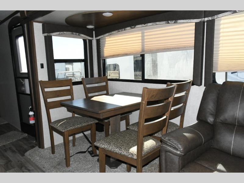 Outside, you’ll love the dual power awnings that create a shaded patio space perfect for entertaining, relaxing, or enjoying a meal outdoors. The power tongue jack makes setup simple, while the heated, enclosed underbelly ensures you’re ready for year-round camping.