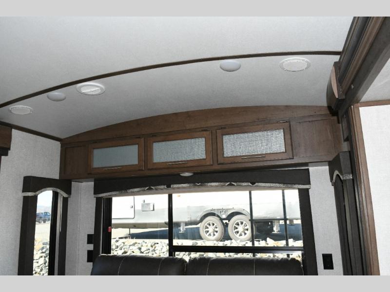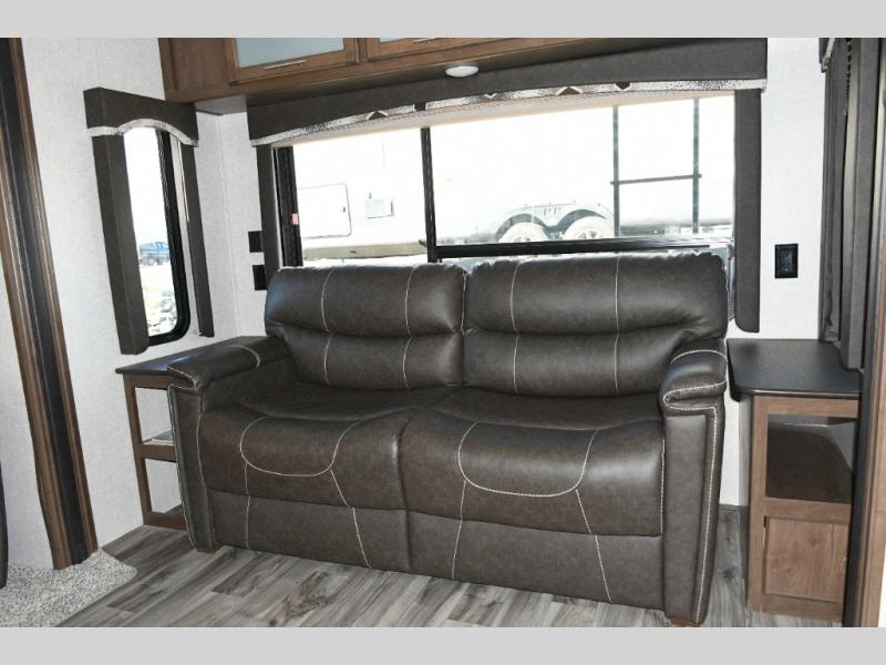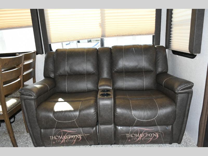 Step inside and you’re welcomed by a bright, spacious living area thanks to oversized panoramic windows and dual opposing slides. The rear living room features a fold-flat sofa, pillow-top theater seating, and an entertainment center that makes it easy to settle in for movie night or relax after a day outdoors. Dimmable lighting lets you set the mood, whether it’s game night or a quiet evening in.
