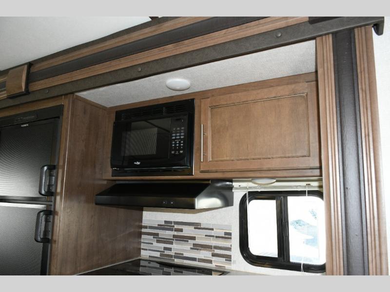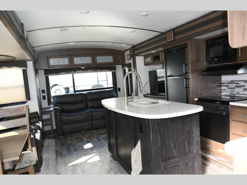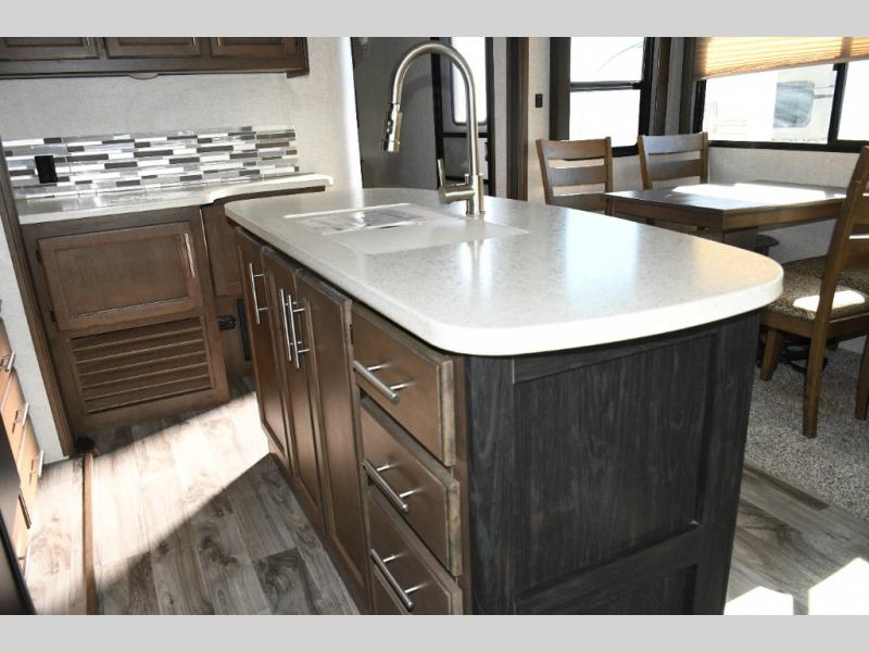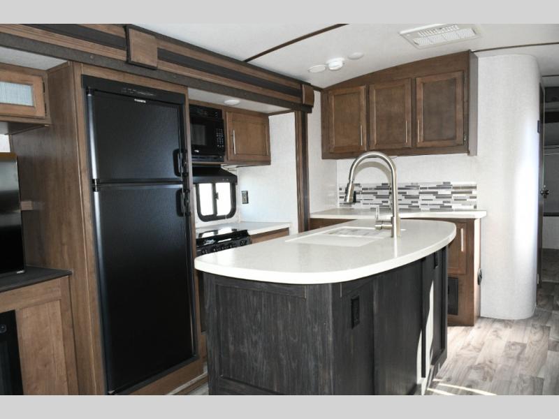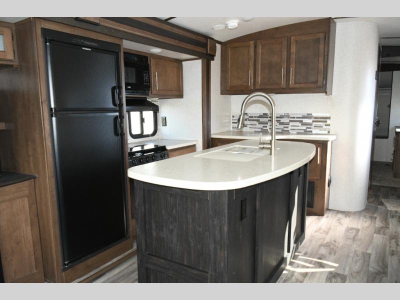 The center island with a deep sink makes meal prep simple, while the three-burner range, oven, microwave, and large refrigerator handle everything from quick snacks to full dinners. With plenty of storage and counter space, this kitchen is designed to keep everyone fueled up for the next adventure.