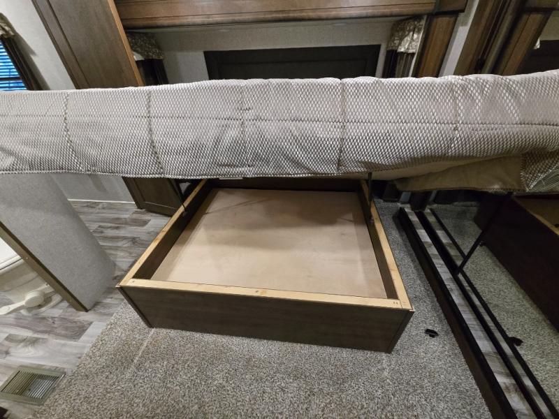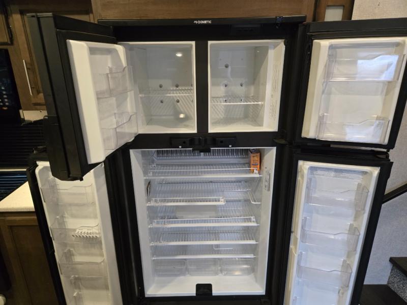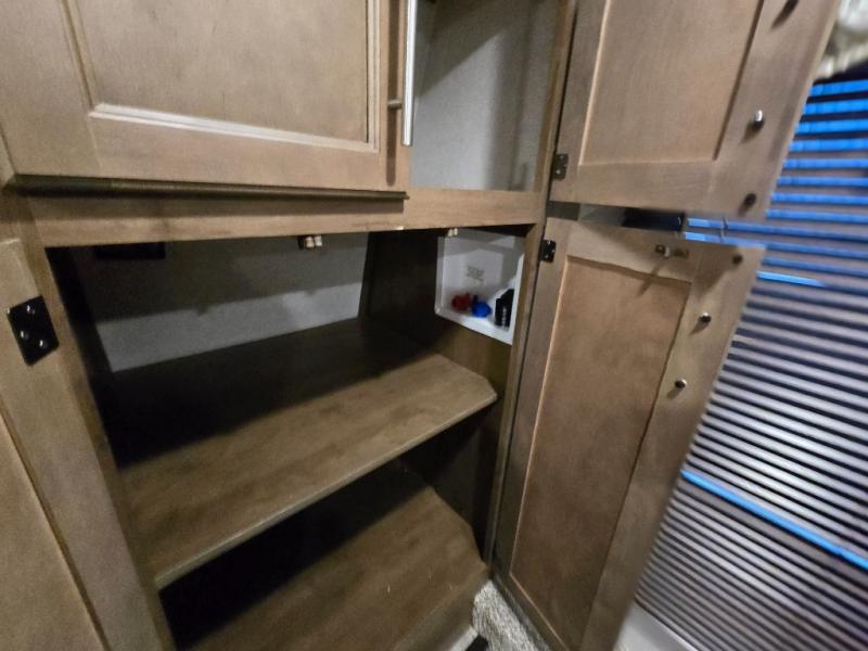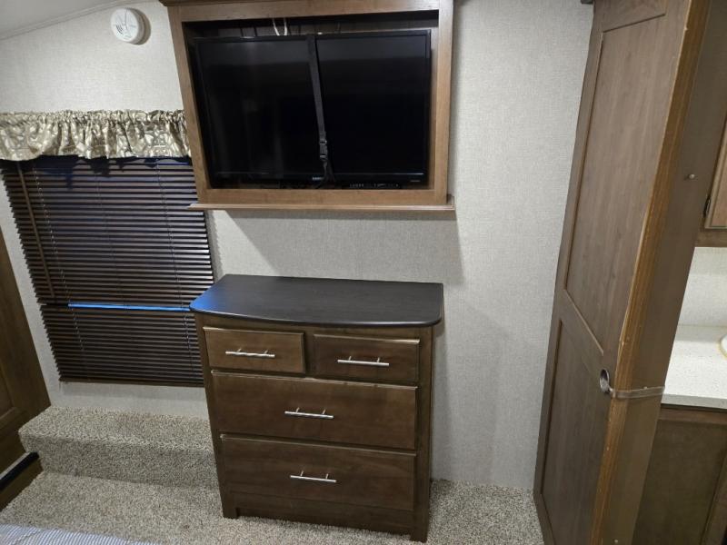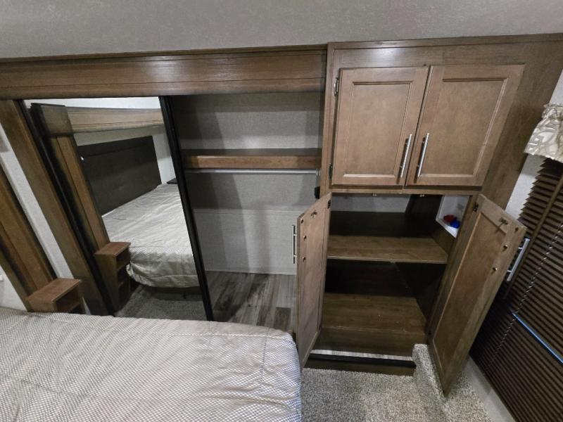 This Cougar fifth wheel 344MKS will have you envisioning all the campgrounds you will visit this year. You might even decide to invite the grandkids on a few of the trips thanks to the extra sleeping space on the furniture when folded down. Once at your destination, you can began setting up the inside by pushing the button to open up the triple slides for more interior floor space. The cook can began making dinner with all the counter space from the kitchen island and storage in the pantry. You might even watch TV, rest by the fireplace, or take a nap in the master bedroom. You will find plenty of storage for your clothes in the bedroom's full height wardrobe and dresser. Outside, the unobstructed pass-through storage allows you to bring along larger outdoor camping items, and the two awnings offer an outdoor living space protected from the elements. Take a look inside and outside, then load up for your next trip.