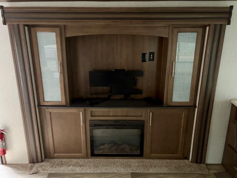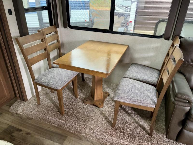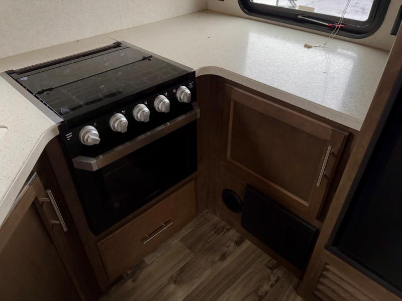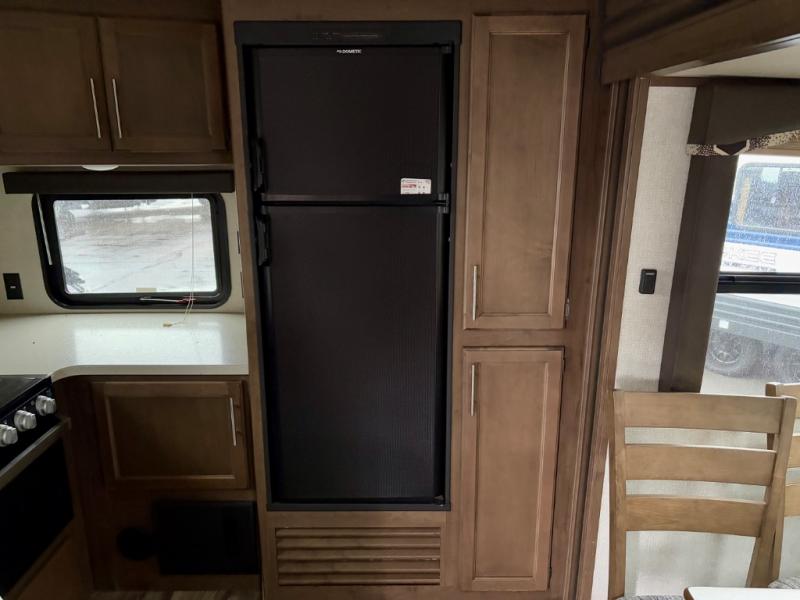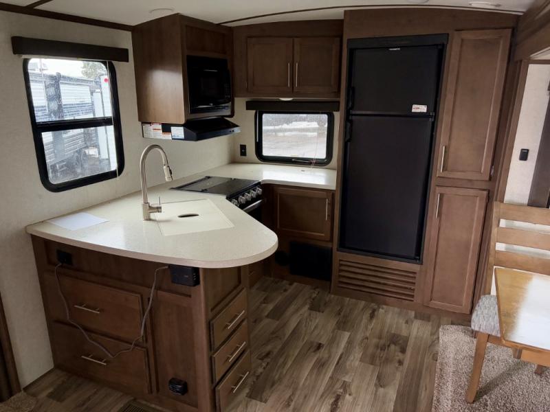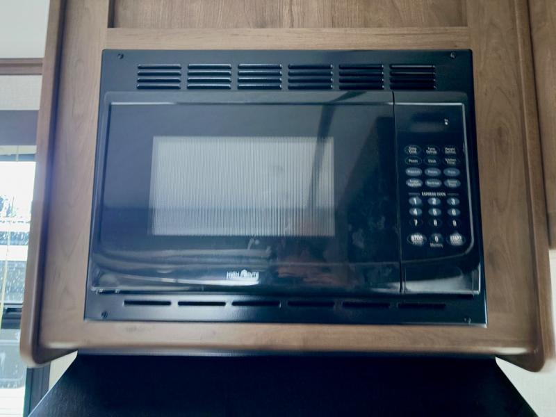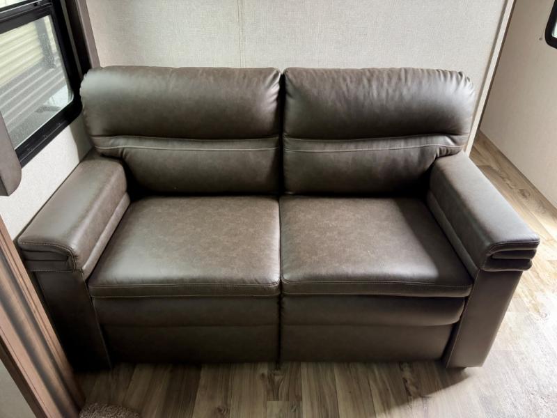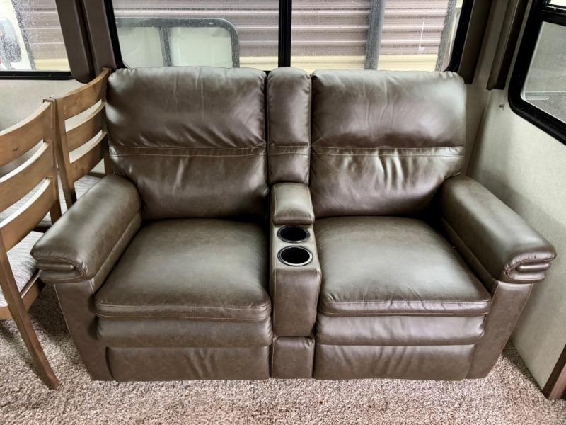 After riding bikes around the campground or hiking the local trails, you can return to this travel trailer to make lunch on the outside capital grill and grab a drink from the mini refrigerator. You might even choose to make your meal inside with full amenities located along the rear wall and U-shaped counter. Afterwards you can take turns getting cleaned up in the full bathroom with double entry doors which is pretty convenient especially at night from the front master bedroom. There is plenty of seating in the living area including theater seats for movie night. Take a look!