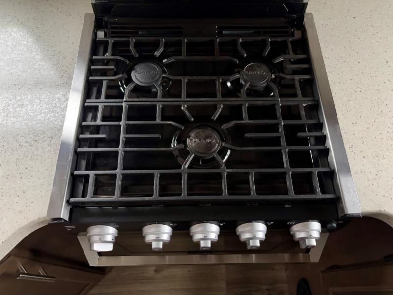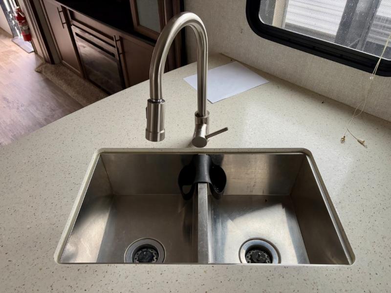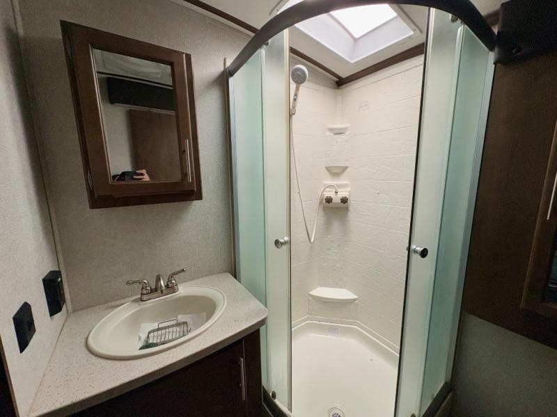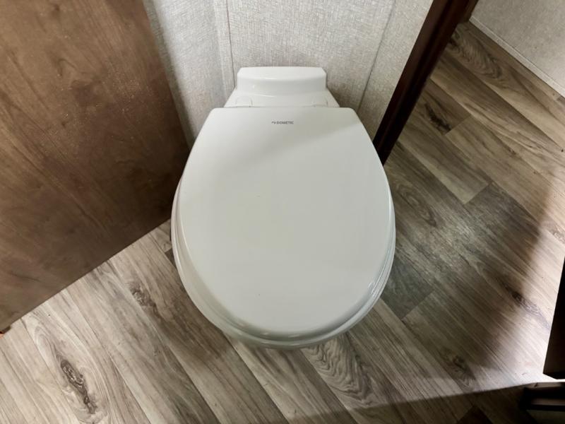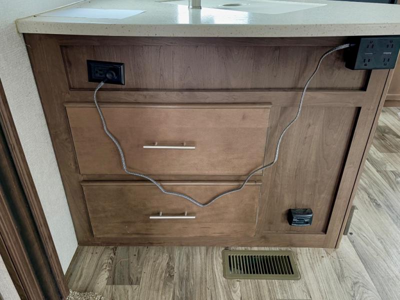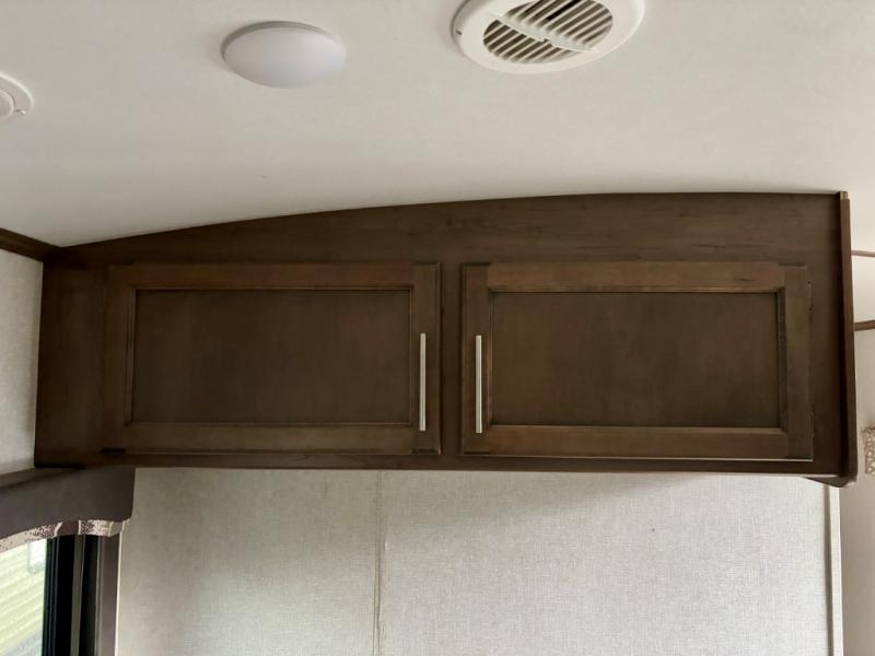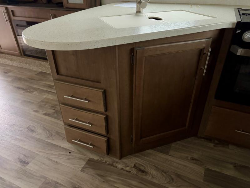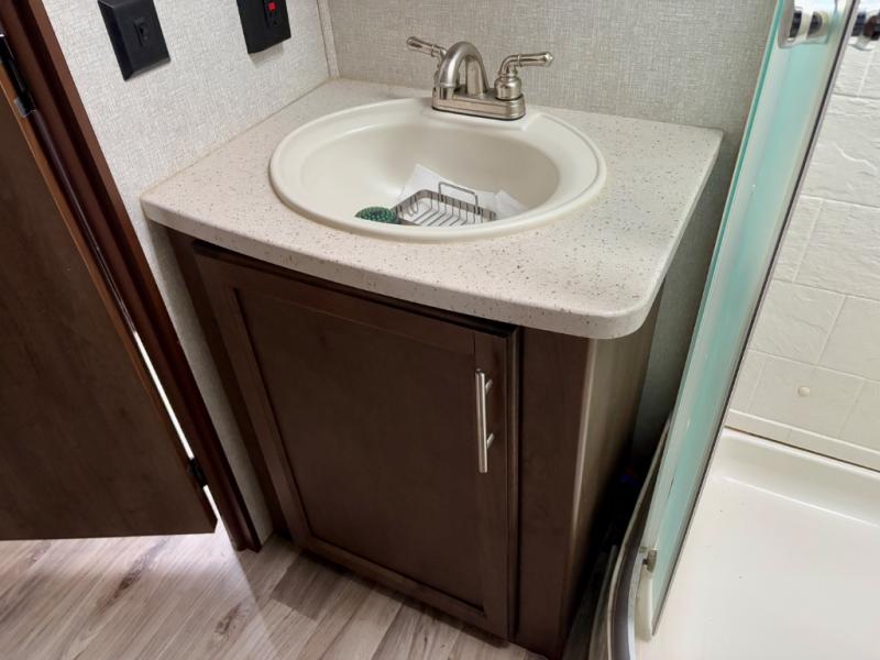 After riding bikes around the campground or hiking the local trails, you can return to this travel trailer to make lunch on the outside capital grill and grab a drink from the mini refrigerator. You might even choose to make your meal inside with full amenities located along the rear wall and U-shaped counter. Afterwards you can take turns getting cleaned up in the full bathroom with double entry doors which is pretty convenient especially at night from the front master bedroom. There is plenty of seating in the living area including theater seats for movie night. Take a look!