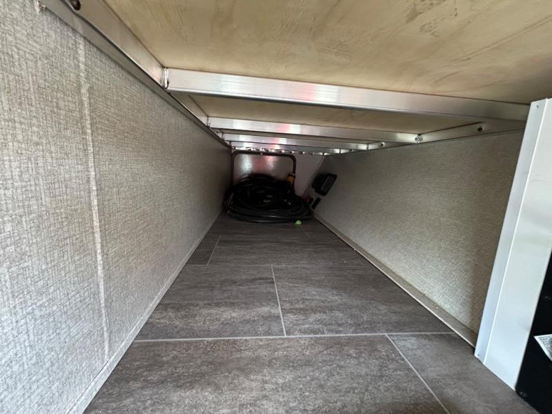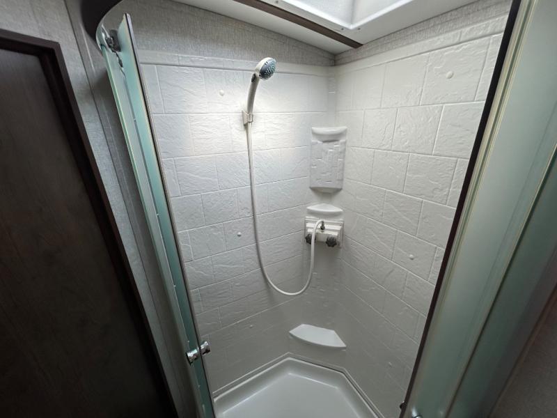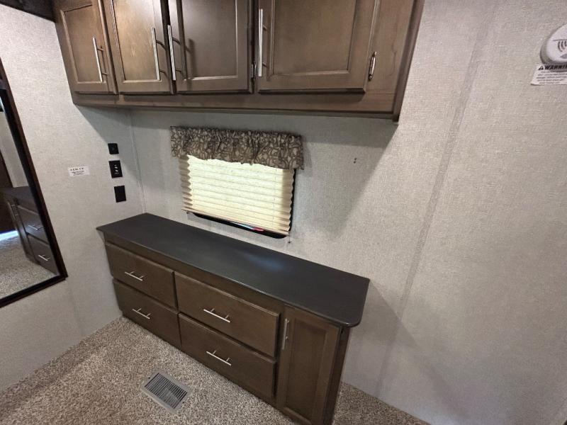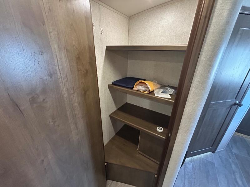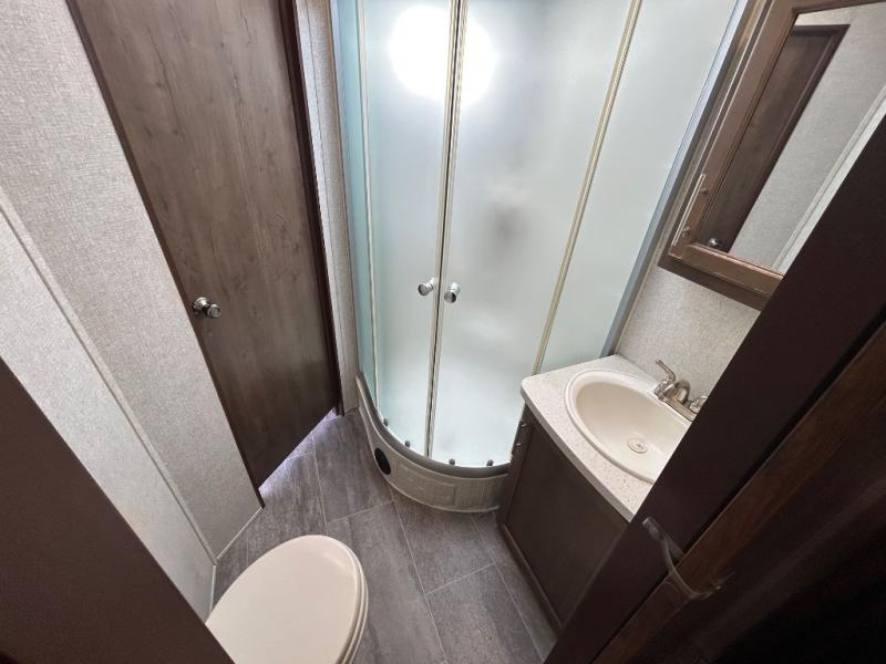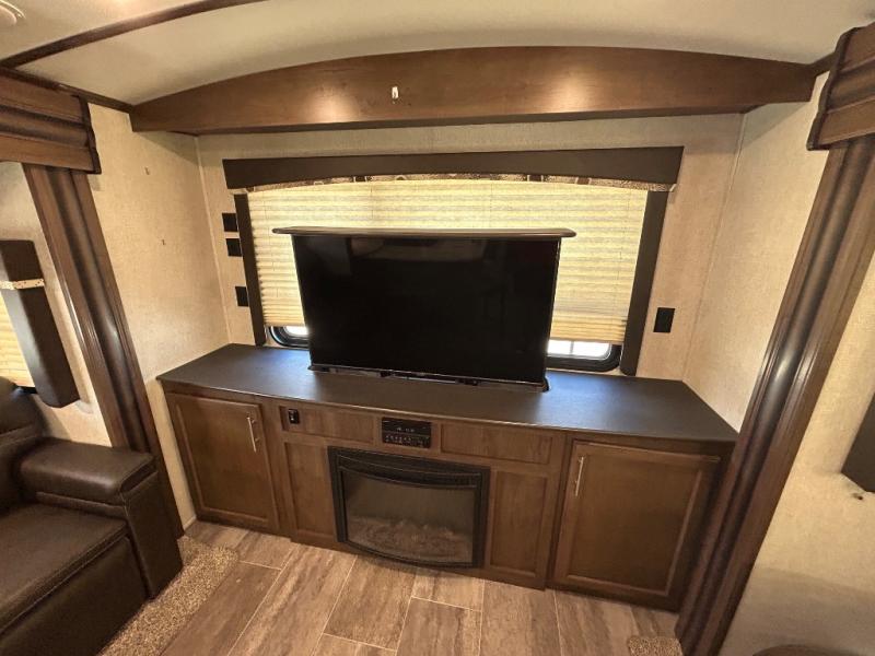 When you are ready for outdoor adventure and indoor comforts, this travel trailer is waiting! Once you have arrived at your destination the power jack will help make setting up a breeze. Inside, you will find a pop-up TV including storage along the rear wall for easy viewing from all the furniture including the two recliners in this combined living and kitchen area. Dual access into the bathroom comes in handy when you have extra friends over. There are triple slide outs providing more floor space for everyone, and the large pantry allows you to stock up at the store before heading out, plus there is much more to see!