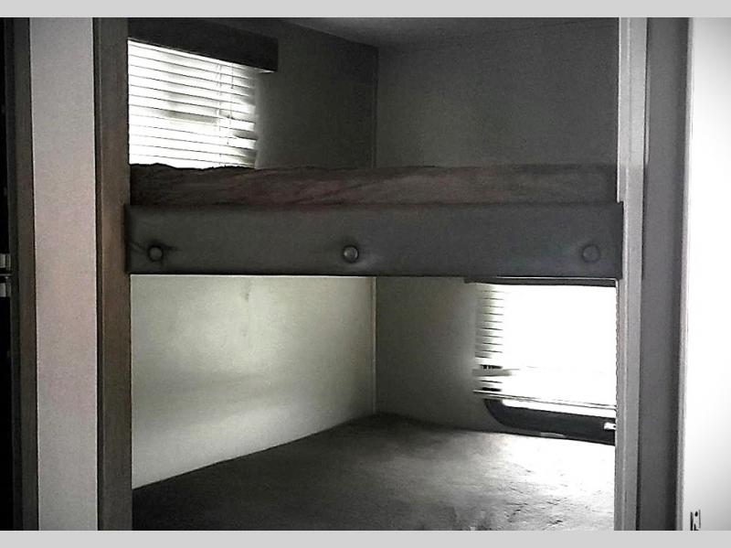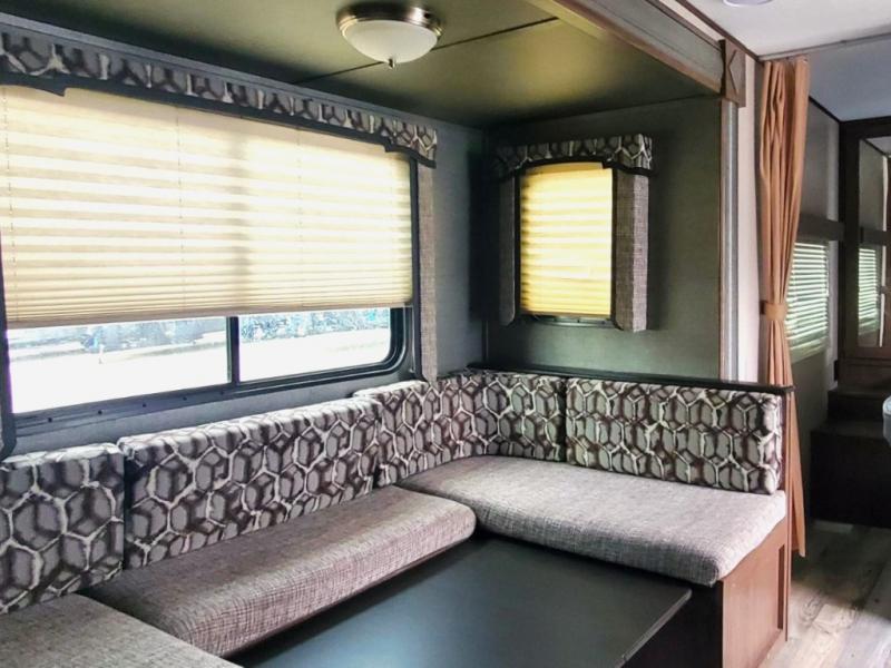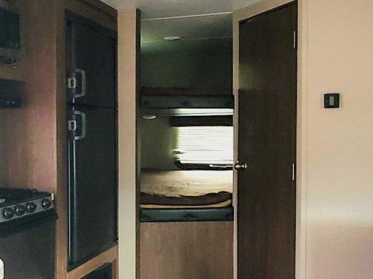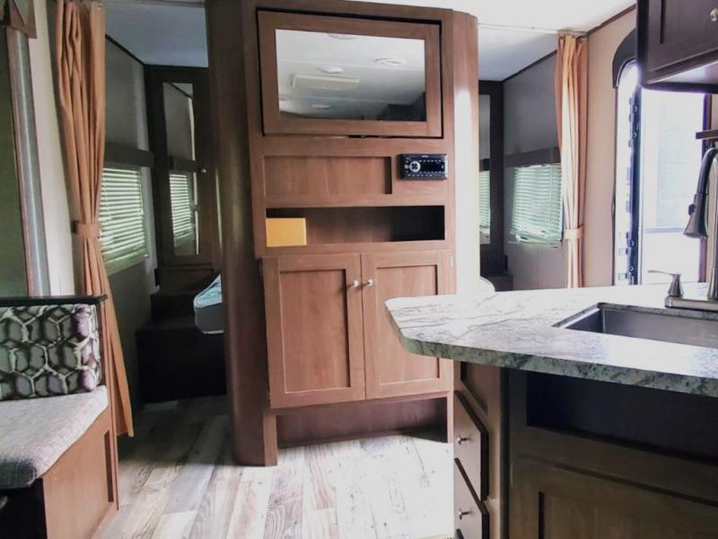 This Keystone Hideout travel trailer features all the amenities you need to enjoy camping, including a single slide for added living space and double-size bunks for extra sleeping space. Along either side of the entertainment center you will find accordion doors which you can close to provide complete privacy in the front bedroom, and within the slide is a U-shaped dinette that helps this trailer sleep eight people each night. When you want to spend more time outside, then the outdoor kitchen is ideal for you! Now you can watch your kids ride their bikes while you are preparing lunch or dinner.