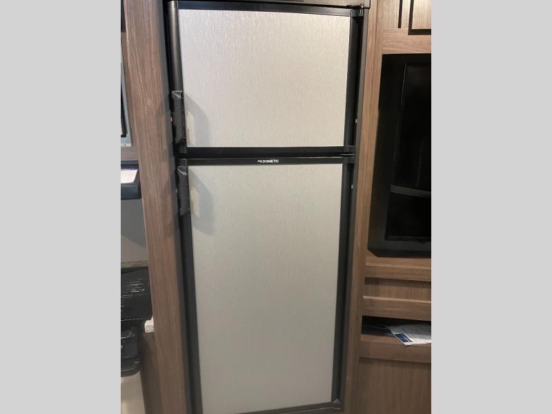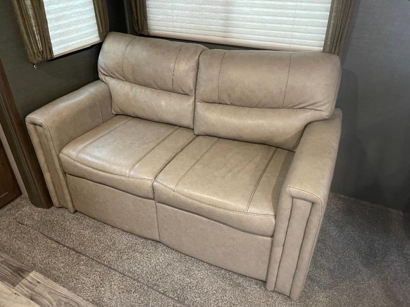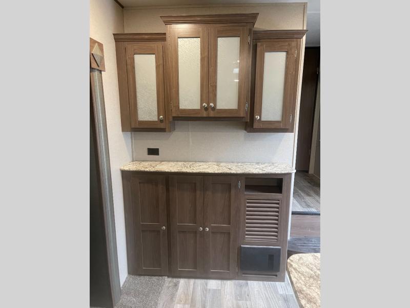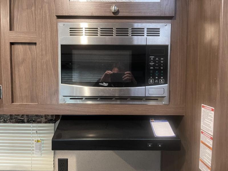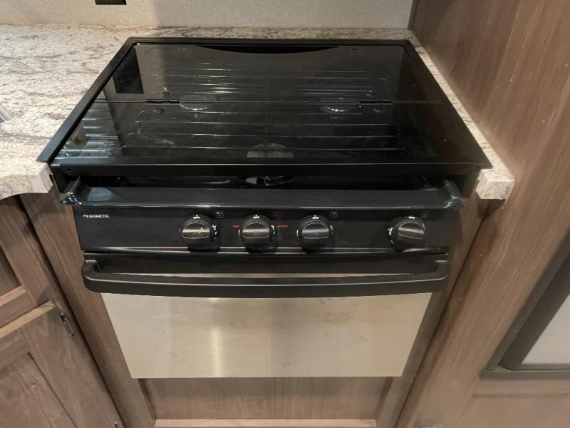 When you choose to camp with this Hideout fifth wheel, you are choosing a quality unit for your family. Before you head inside, check out the outdoor kitchen with a pull-out stove and refrigerator which will make summertime grill outs enjoyable for everyone. When you want to visit with your family and friends inside, it is easy to do so with the U-shaped dinette and tri-fold sofa because of their location on the single slide. Plus, both the sofa and dinette easily convert into additional sleeping space giving this trailer the capacity to sleep six people each night.