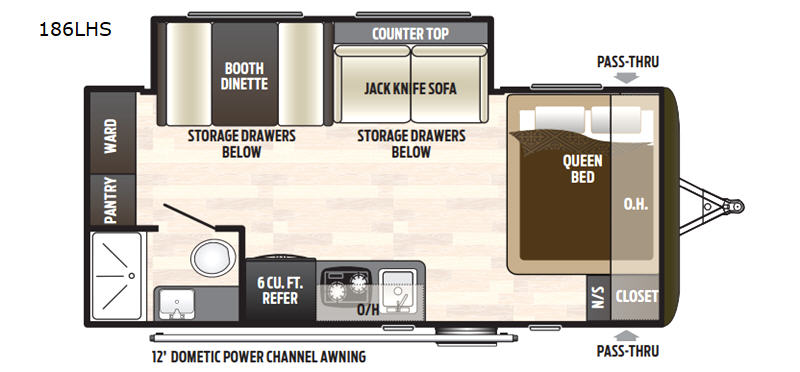 Abundant storage throughout makes this Hideout Single Axle unit easy to keep organized! You will love the exterior pass-though compartment up front for all of your outdoor camping gear and yard games. With a 12' power awning you can enjoy the evening playing corn-hole and roasting marshmallows over a campfire. When inside, there is plenty of space thanks to the large slide which features a booth dinette and jack knife sofa, and both seating spaces offer storage drawers as well.