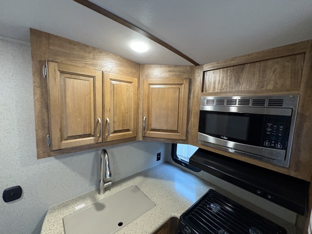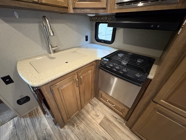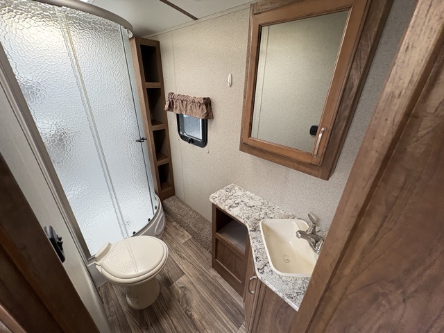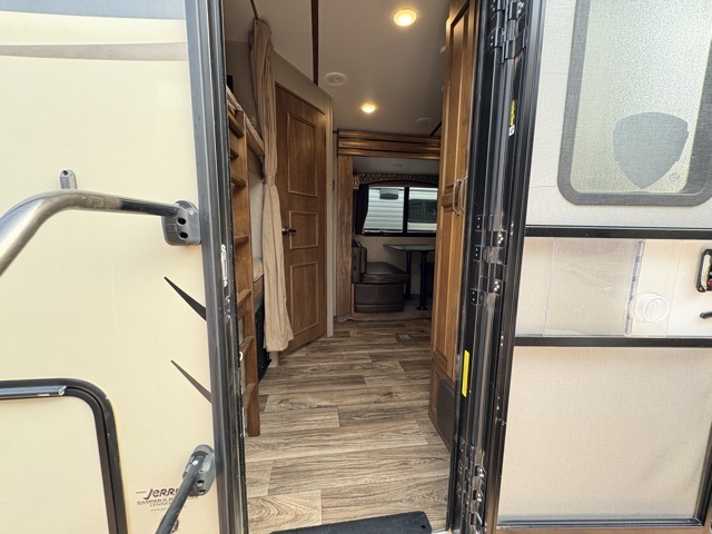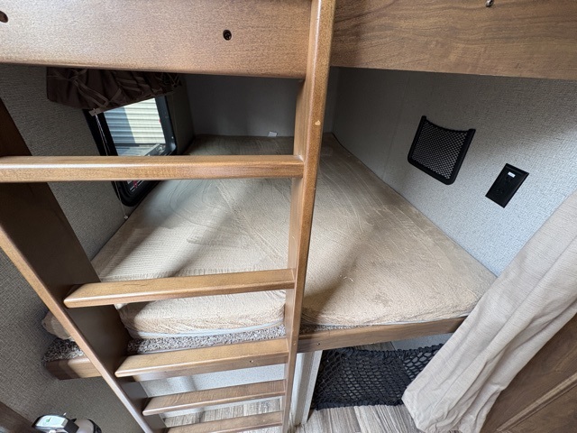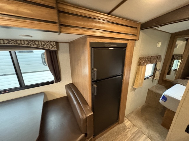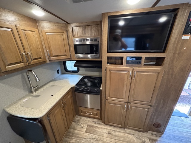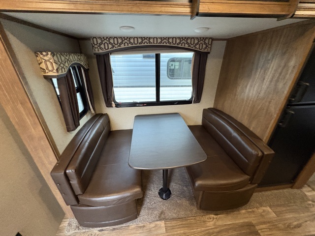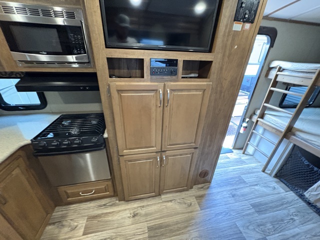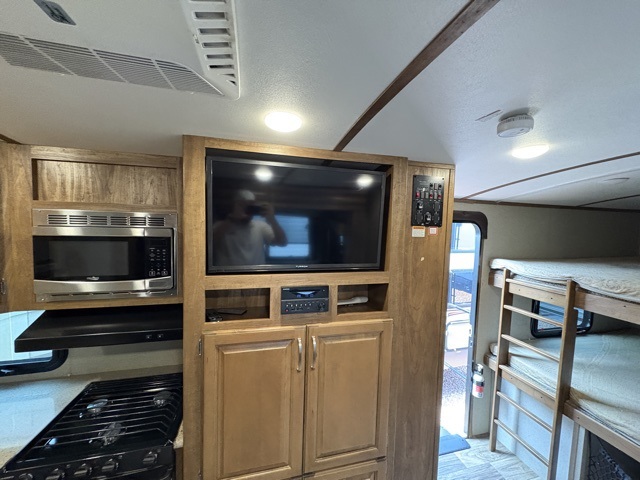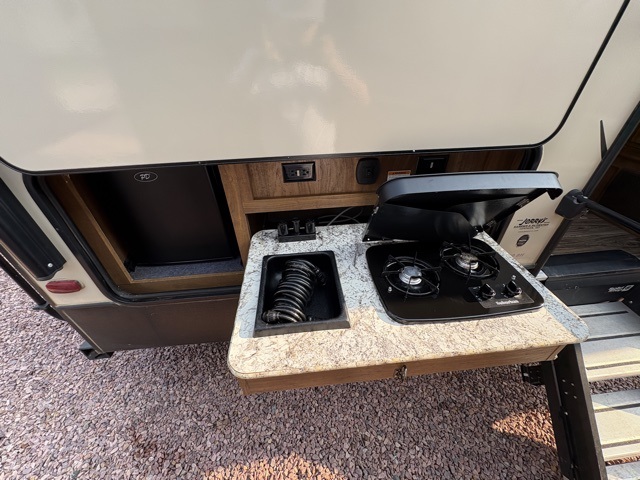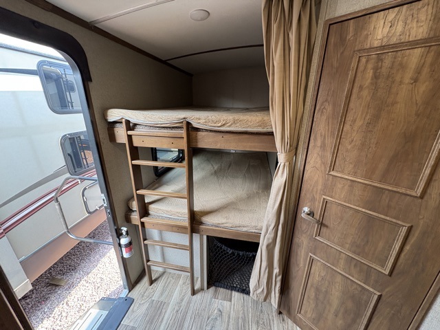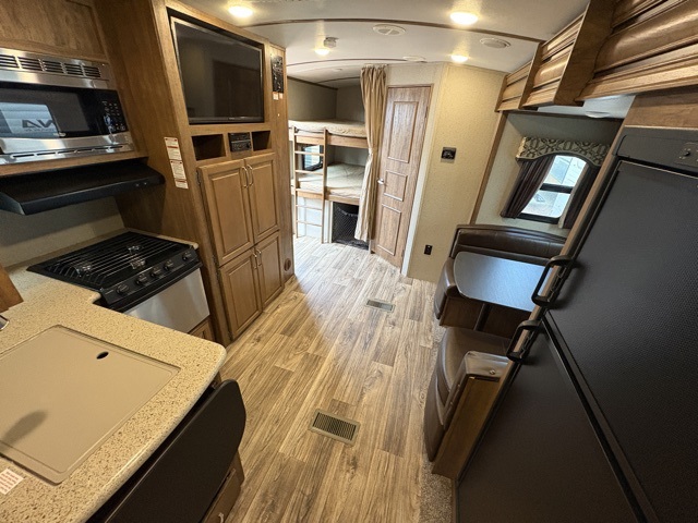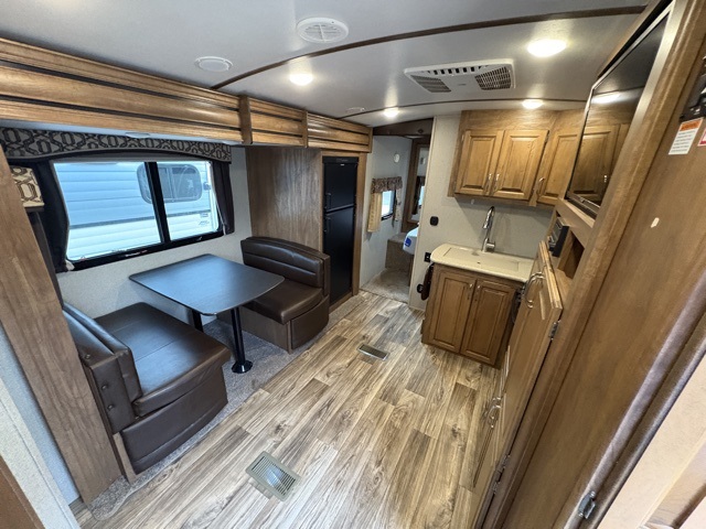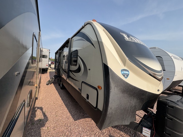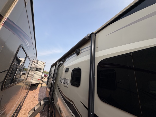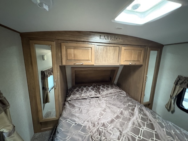 Taking this Laredo travel trailer on your next family excursion is the best decision you could make. From the set of double-size bunk beds for the kids to the queen bed in the private bedroom for yourself, this unit has the ability to sleep seven people each night when you also fold down the dinette. The full bathroom next to the bunks includes a radius shower making it easy for everyone to get ready each morning. Cooking a hot and delicious meal has never been easier because of the two kitchens which are located inside and outside. The pull-out camp kitchen allows you to enjoy the great outdoors while making meals for everyone, and the indoor kitchen includes more appliances.