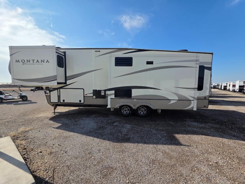 When packing for your next trip in a Keystone Montana luxury fifth wheel you will appreciate the enormous drop frame pass-through storage compartment, the MORyde "Step Above" entry steps with strut assist, and the LED light package including "super-bright" taillights with backup marker and off-door scare light. The Montana 20th Anniversary Edition adds exclusive features such as the Key TV satellite prep, LED accent lighting, Tru-fit slide construction, and Easy Sweep resilient flooring. You will love the in-floor heating ducts, which allow for more airflow to be distributed evenly for optimal comfort. the LED motion sensor light in the pass-through compartment and convenience center, plus the Four Season Living package allowing you to travel whenever you like. It's time to find the luxury fifth wheel you can enjoy for years to come, choose a Montana by Keystone today!