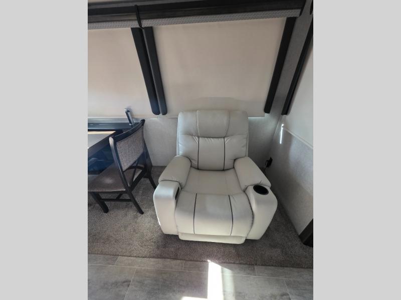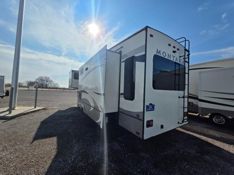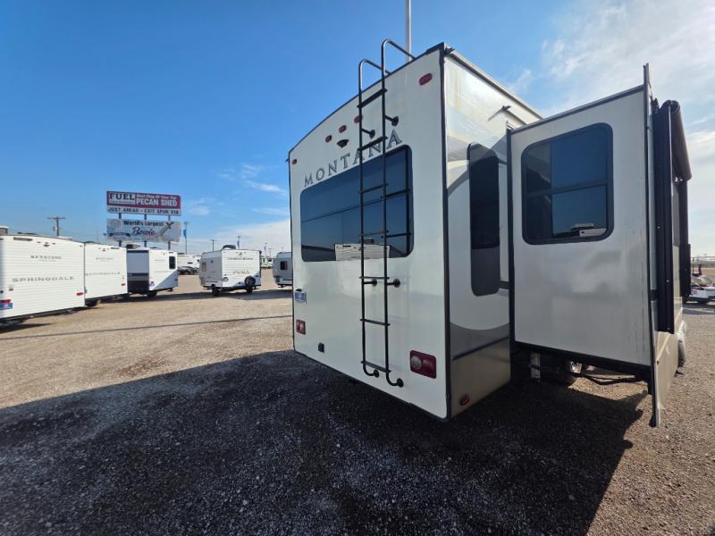 When you are ready to head out in comfort to see the countryside, take this Montana with you. This fifth wheel offers a rear living and kitchen area with dual opposing slide outs for more interior floor space, plus seating for the whole gang including theater seats with power recliners. You are sure to enjoy the HDTV and fireplace on those inside camping days. The kitchen offers the chef a center island for preparing food, an 18 cu. ft. RV refrigerator, a convection microwave, a coffee station for the coffee lover in the family, and a pantry for your dry goods, plus more. You will also find plenty of storage throughout for all your things. Outside there are two awnings providing an outdoor living space, and you will find additional storage. Take a look, you will be pleased you did.