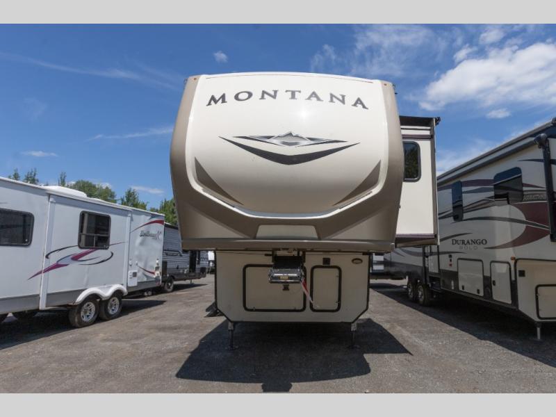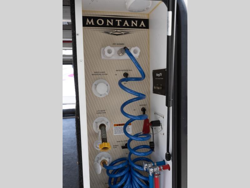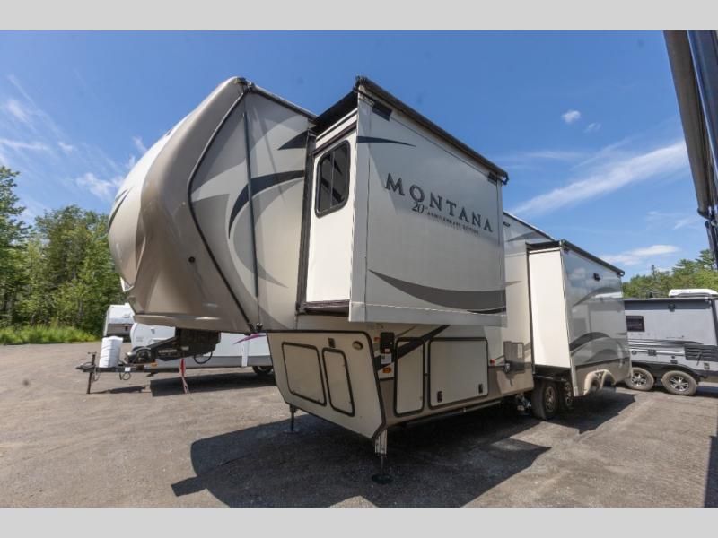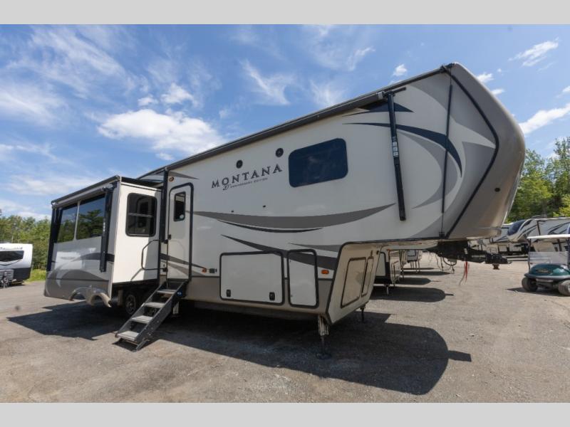 When packing for your next trip in a Keystone Montana luxury fifth wheel you will appreciate the enormous drop frame pass-through storage compartment, the MORyde "Step Above" entry steps with strut assist, and the LED light package including "super-bright" taillights with backup marker and off-door scare light. The Montana 20th Anniversary Edition adds exclusive features such as the Key TV satellite prep, LED accent lighting, Tru-fit slide construction, and Easy Sweep resilient flooring. You will love the in-floor heating ducts, which allow for more airflow to be distributed evenly for optimal comfort. the LED motion sensor light in the pass-through compartment and convenience center, plus the Four Season Living package allowing you to travel whenever you like. It's time to find the luxury fifth wheel you can enjoy for years to come, choose a Montana by Keystone today!