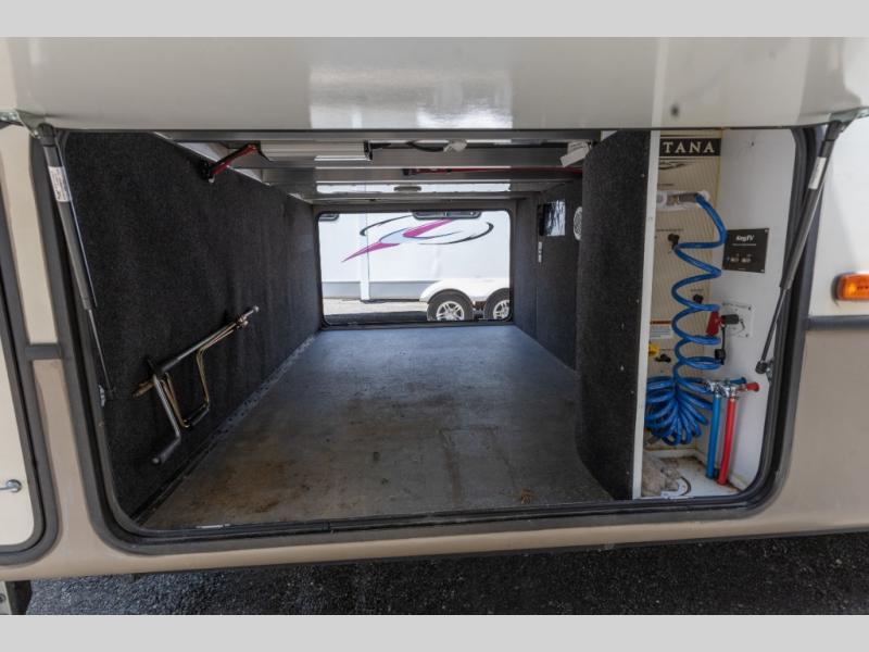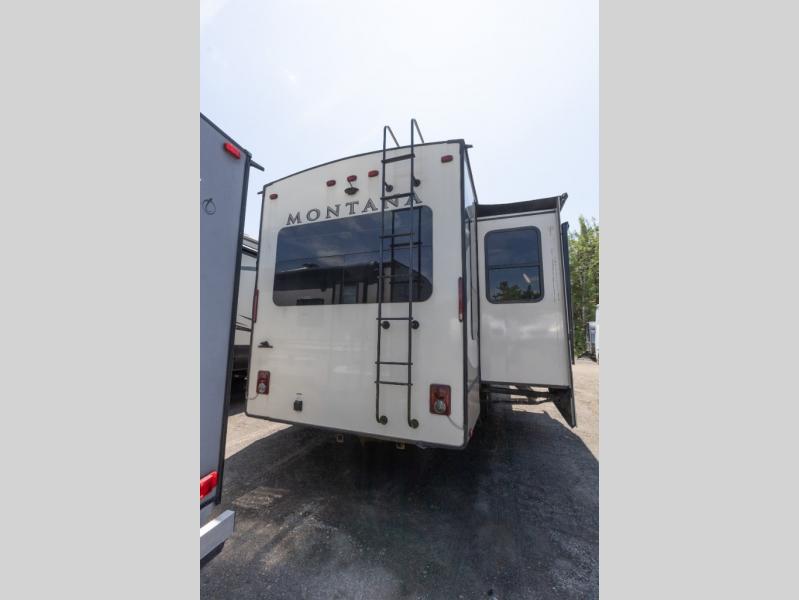 When you are ready to head out in comfort to see the countryside, take this Montana with you. This fifth wheel offers a rear living and kitchen area with dual slide outs for more interior floor space, plus seating for the whole gang including theater seats with power recliners. You are sure to enjoy the HDTV and fireplace on those inside camping days. The kitchen offers the chef a center island for preparing food, an 18 cu. ft. residential refrigerator, a convection microwave, a coffee station for the coffee lover in the family, and a pantry for your dry goods, plus more. You will also find plenty of storage throughout for all your things. Outside there are two awnings providing an outdoor living space, and you will find additional storage. Take a look, you will be pleased you did.