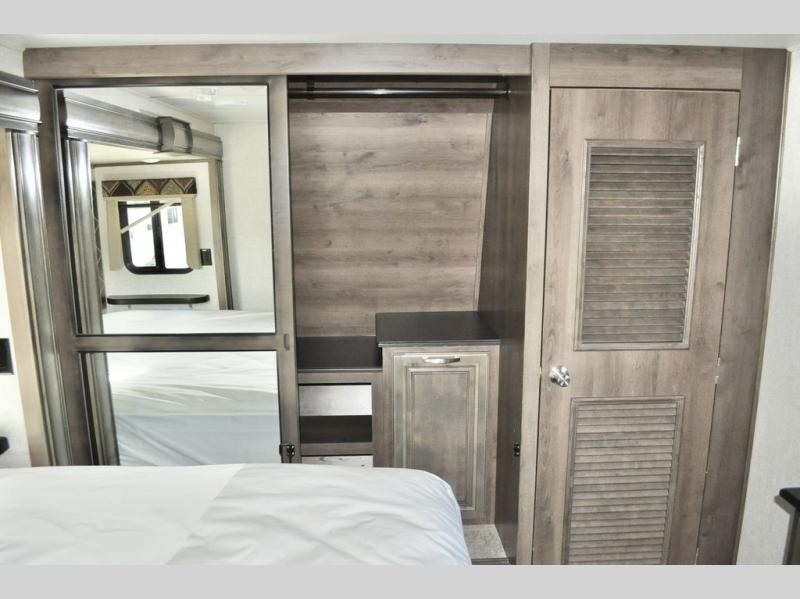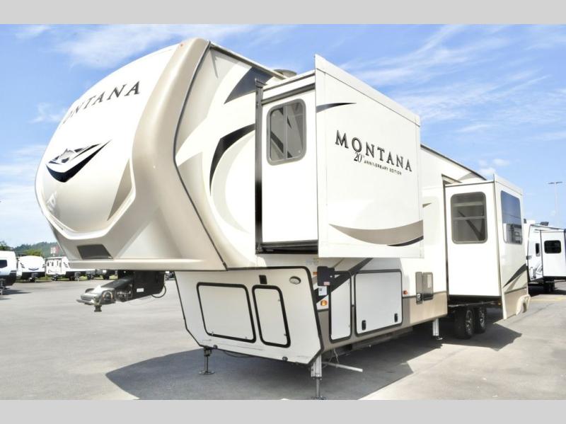 When packing for your next trip in a Keystone Montana luxury fifth wheel you will appreciate the enormous drop frame pass-through storage compartment, the MORyde "Step Above" entry steps with strut assist, and the LED light package including "super-bright" taillights with backup marker and off-door scare light. The Montana 20th Anniversary Edition adds exclusive features such as the Key TV satellite prep, LED accent lighting, Tru-fit slide construction, and Easy Sweep resilient flooring. You will love the in-floor heating ducts, which allow for more airflow to be distributed evenly for optimal comfort. the LED motion sensor light in the pass-through compartment and convenience center, plus the Four Season Living package allowing you to travel whenever you like. It's time to find the luxury fifth wheel you can enjoy for years to come, choose a Montana by Keystone today!