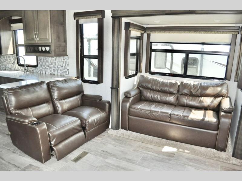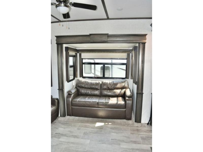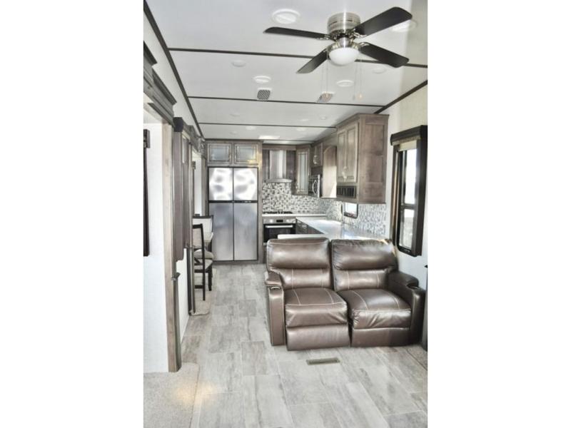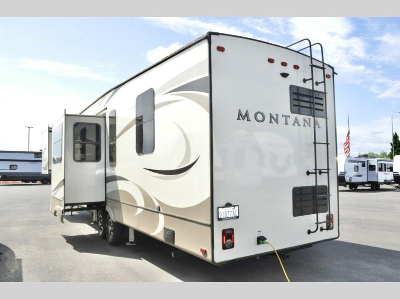 Just imagine you and your spouse and maybe your children camping at a state park or local RV spot in this Montana fifth wheel. Everyone will enjoy the floor space throughout provided by four slide outs. The rear kitchen layout offers plenty of counter space and all the appliances necessary to make meals the whole trip including an 18 cu. ft. RV refrigerator and convection microwave. Now imagine yourself relaxing on one of the two opposing hide-a-bed sofas after hiking, biking, or fishing earlier that day. There is a HDTV, a fireplace, and theater seats with power recliners as well. It's time to stop dreaming about your next get-a-way trip, and start living it.
