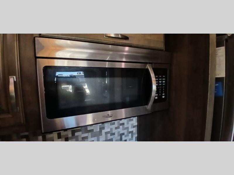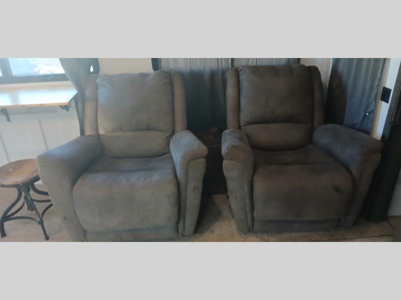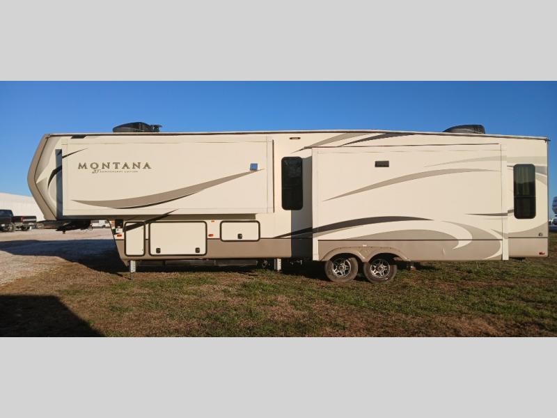 It's time to start planning your next campout with family and friends in this Montana fifth wheel. Just imagine a wide open living and kitchen area thanks to the dual opposing slide outs. You are sure to enjoy the theater seats with power recliners and additional furniture when watching the HDTV while keeping warm from the fireplace. The cook can prepare meals and the guests can wash the dishes on the kitchen island. There is an 18 cu. ft. residential refrigerator and pantry to keep all your food stowed away, plus a convection microwave and three burner range to make a warm meal. The master bedroom includes a slide out that stretches into the hallway giving you more space to add a washer and dryer if you like that option. You also have dual entry into the bath as an added convenience especially at night. You will find plenty of storage throughout for all your things including an entry wardrobe/closet. When you want to enjoy the outdoors, you can relax under one of the two awnings. You will also appreciate the 20th anniversary edition enhancements, take a look!