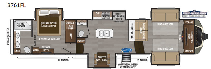 When packing for your next trip in a Keystone Montana luxury fifth wheel you will appreciate the enormous drop frame pass-through storage compartment, the MORyde "Step Above" entry steps with strut assist, and the LED light package including "super-bright" taillights with backup marker and off-door scare light. The Montana 20th Anniversary Edition adds exclusive features such as the Key TV satellite prep, LED accent lighting, Tru-fit slide construction, and Easy Sweep resilient flooring. You will love the in-floor heating ducts, which allow for more airflow to be distributed evenly for optimal comfort. the LED motion sensor light in the pass-through compartment and convenience center, plus the Four Season Living package allowing you to travel whenever you like. It's time to find the luxury fifth wheel you can enjoy for years to come, choose a Montana by Keystone today!