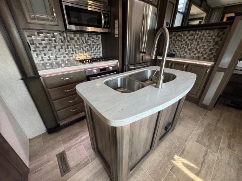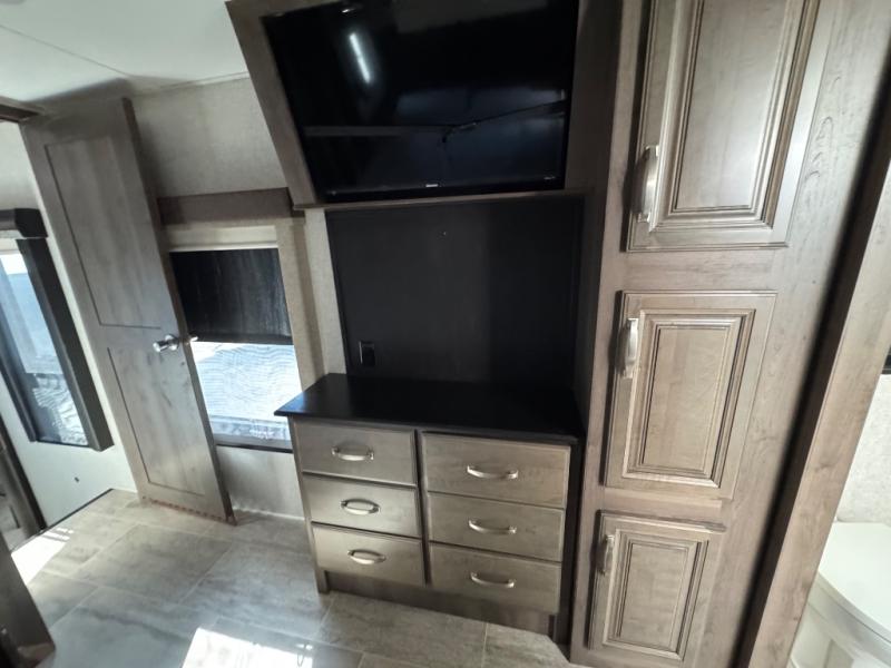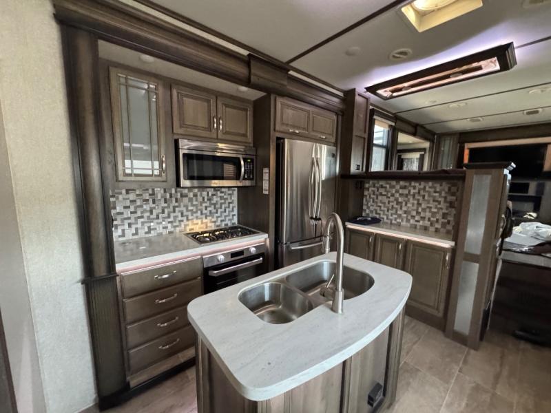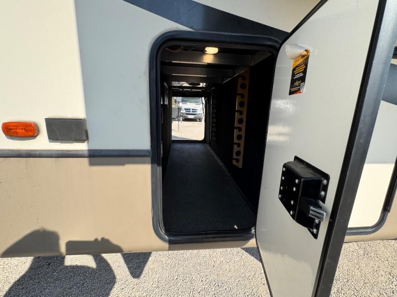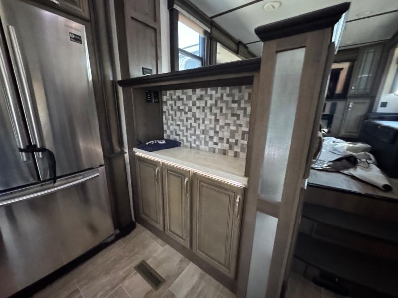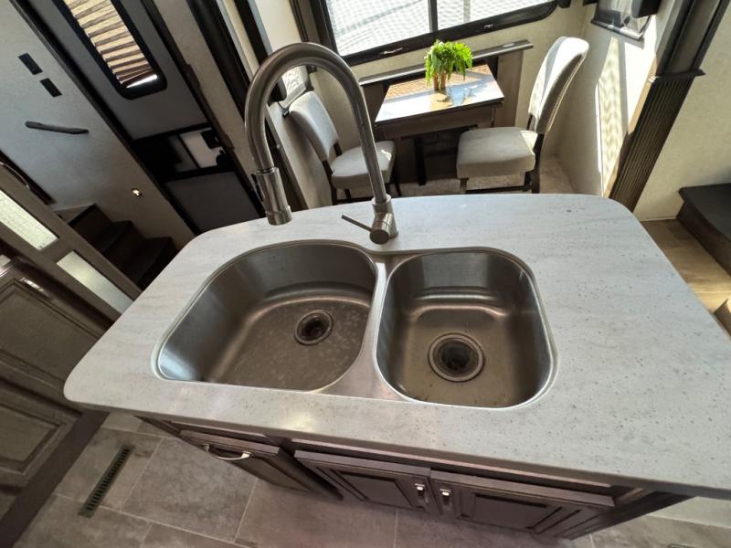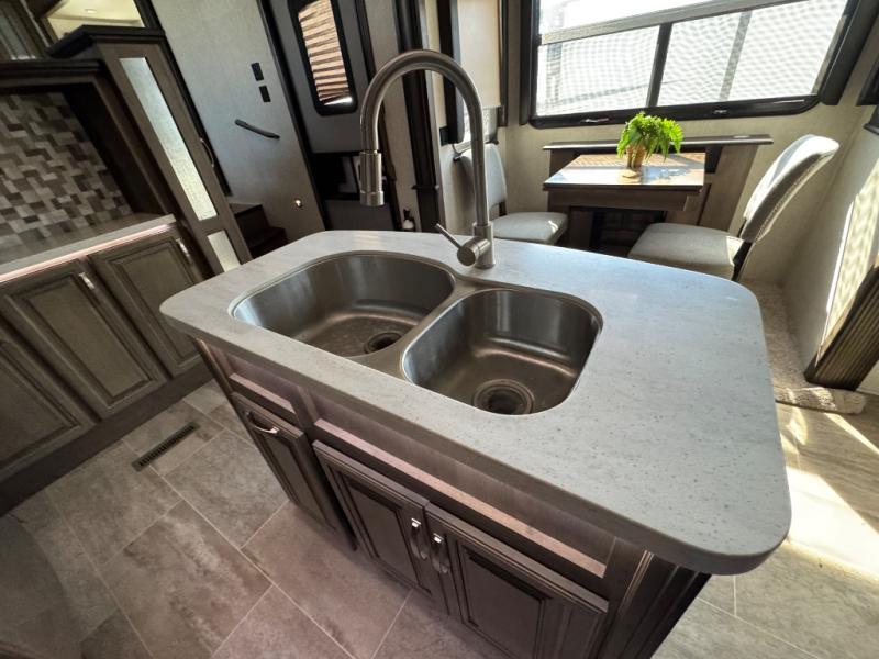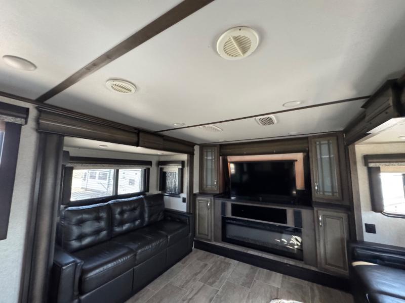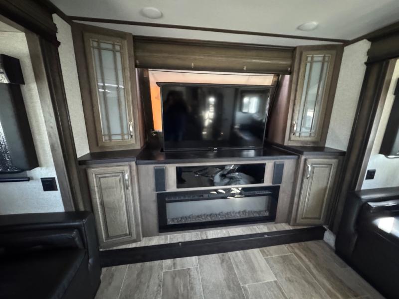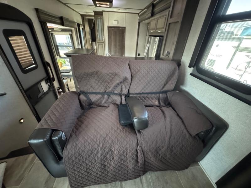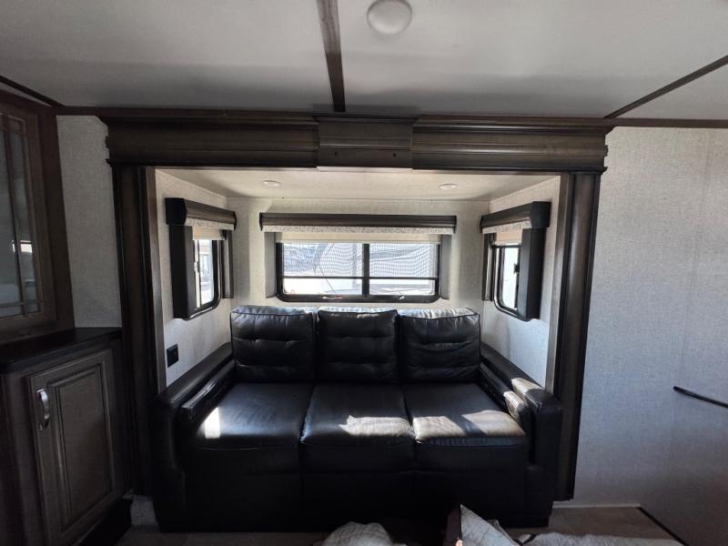 The full-timer or weekend warrior will enjoy the separate living area in the front of this fifth wheel when watching the big game on the HDTV, or enjoying the views out the patent-pending windshield. You can invite camping friends over thanks to the dual opposing hide-a-bed sofas and theater seating with power recliners. Your friends can even spend the night as the furniture offers extra sleeping space as well. The centrally located kitchen provides lots of space to make meals and snacks, plus storage for your cold items and dry goods in the residential refrigerator and pantry. You might even offer everyone a cup of Joe from the coffee station. The handy half bath is off the kitchen, plus you will find a center island and free standing dinette. Take a walk through the bedroom to find clothing and blanket storage, and a queen bed as you reach the rear full bathroom. You will also find barn doors that save you space. Take a look!