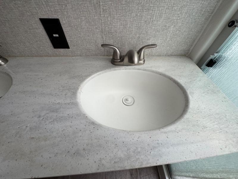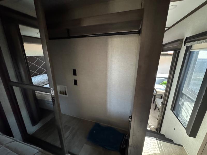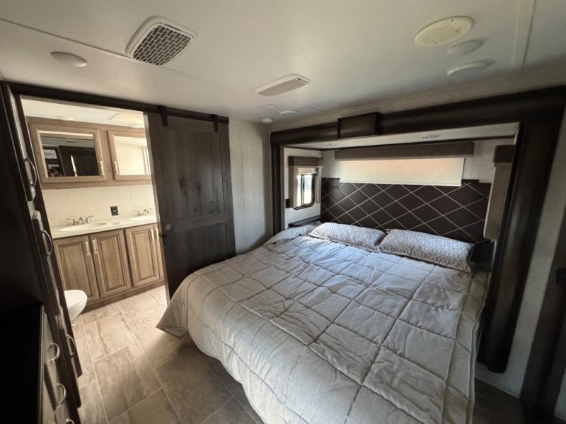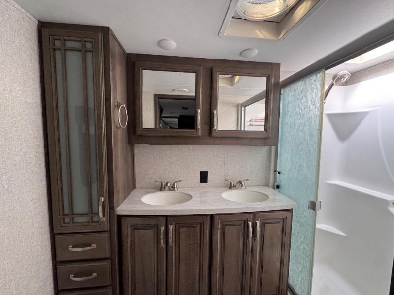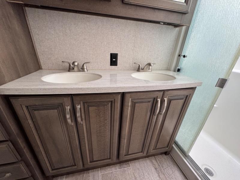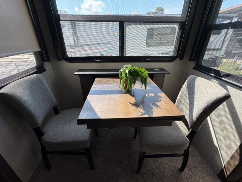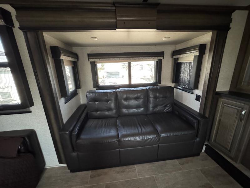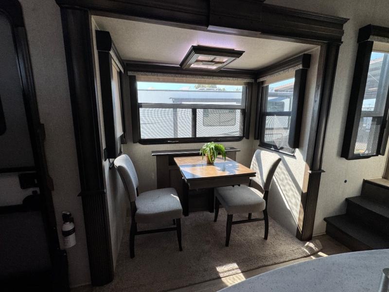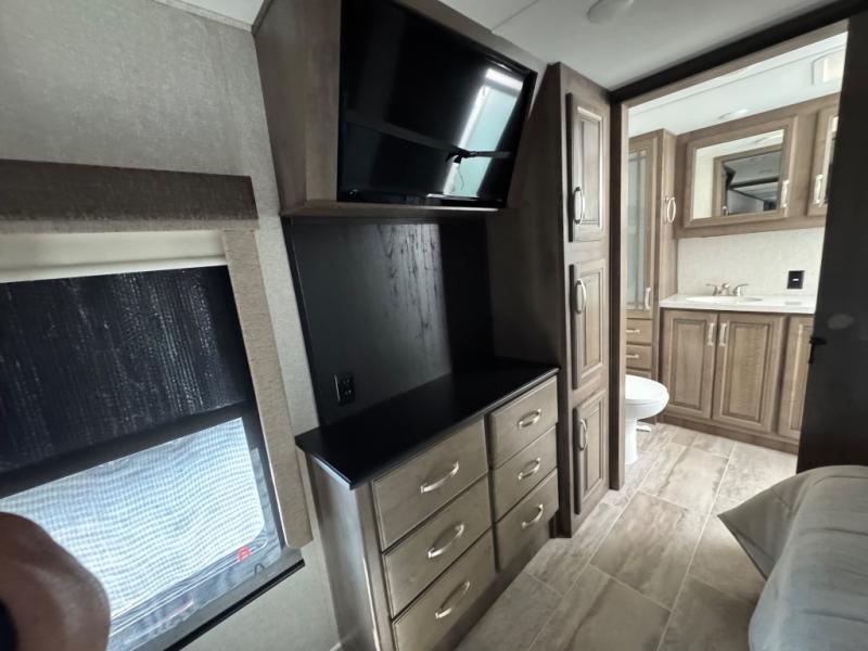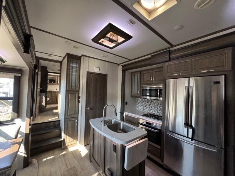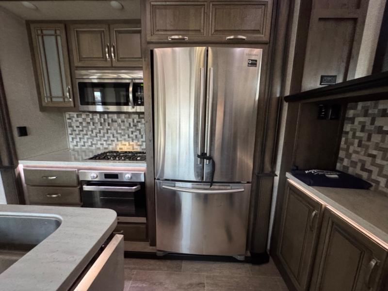 The full-timer or weekend warrior will enjoy the separate living area in the front of this fifth wheel when watching the big game on the HDTV, or enjoying the views out the patent-pending windshield. You can invite camping friends over thanks to the dual opposing hide-a-bed sofas and theater seating with power recliners. Your friends can even spend the night as the furniture offers extra sleeping space as well. The centrally located kitchen provides lots of space to make meals and snacks, plus storage for your cold items and dry goods in the residential refrigerator and pantry. You might even offer everyone a cup of Joe from the coffee station. The handy half bath is off the kitchen, plus you will find a center island and free standing dinette. Take a walk through the bedroom to find clothing and blanket storage, and a queen bed as you reach the rear full bathroom. You will also find barn doors that save you space. Take a look!