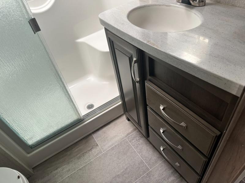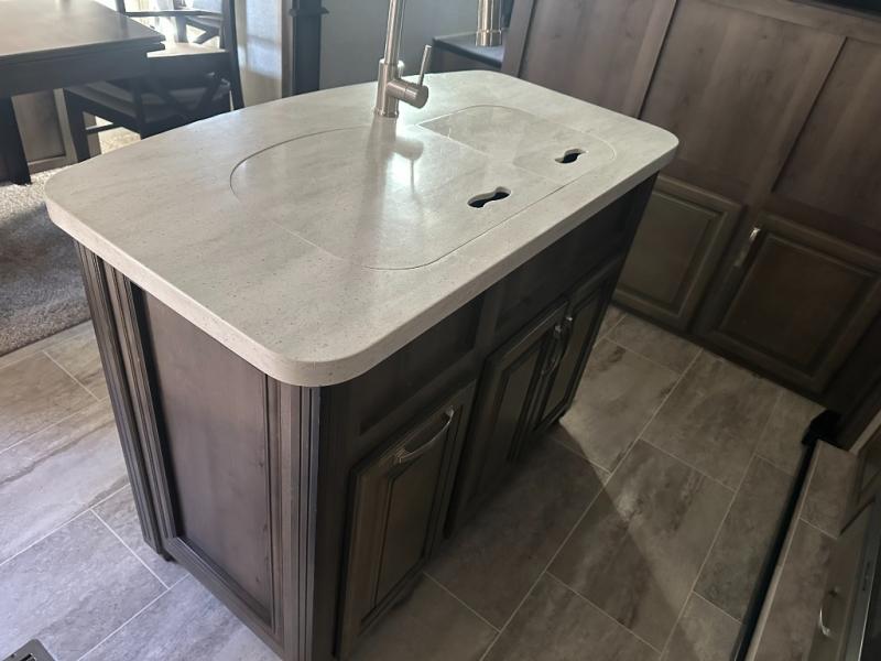 If you want your own space to cook, your own space to watch TV, and your own private bedroom, take a look at this Montana fifth wheel. This layout offers a rear living and entertaining room with plenty of seating including dual hide-a-bed sofas and theater seats with power recliners. Imagine everyone gathered around the HDTV and fireplace to talk about their day, watch a movie, or relax for a while in the warm indoors. The kitchen offers a separate space to make and eat meals. You will find a center island, an 18 cu. ft. residential refrigerator, a convection microwave, and a pantry, plus more. There is inside storage throughout for your clothes, camping gear, and kitchen cookware. And outside there is exterior compartments including a slide out storage tray.