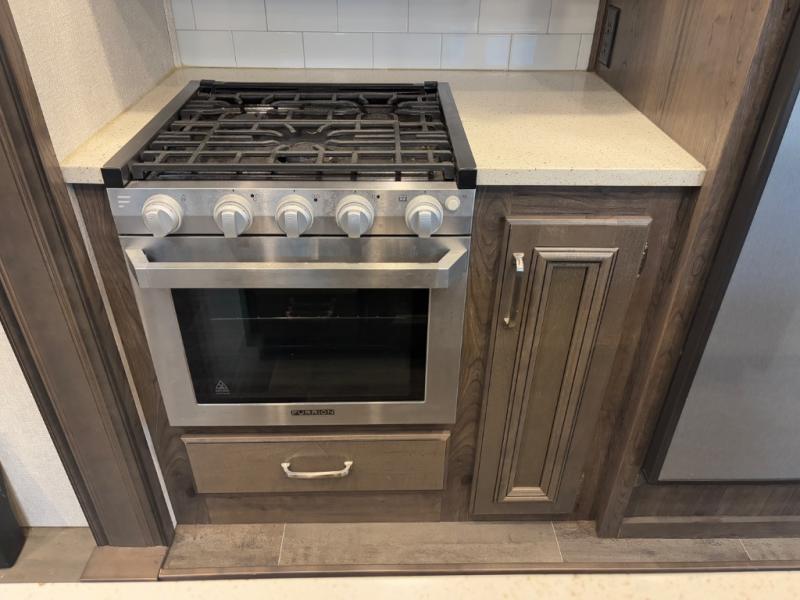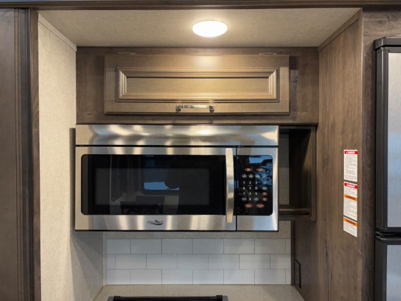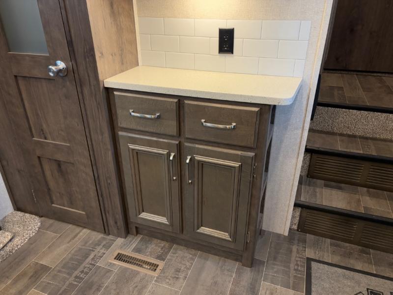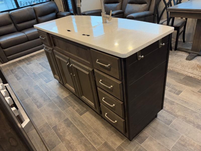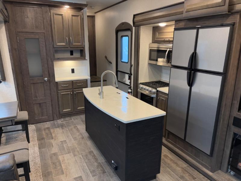 When heading out and setting up in a Keystone Montana High Country fifth wheel you will appreciate the Dexter E-Z Lube axles, Max Turn front cap and radius frame with Hitch Vision, and an enormous drop frame pass-through storage compartment to name a few features. Inside you will find luxury and comfort with the 78" tall main slide outs and flush mounted LED interior lights. The bath features a skylight over the shower, seamless countertops, and a vanity with three drawers for extra storage space!. The chef of the family is going to love the Montana High Country's kitchen with its Furrion 21" two in one stainless steel cooktop and oven, a 30" over-the-range microwave, solid surface countertops, and a high-rise faucet with an integrated pull-out sprayer, plus so much more!