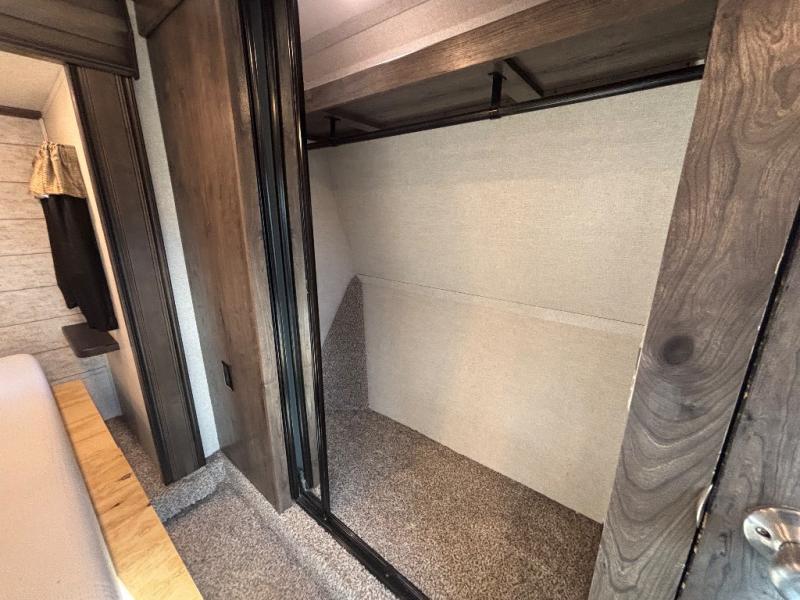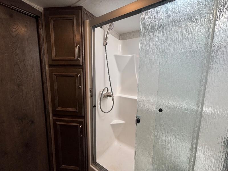 This Montana High Country is the perfect full time fifth wheel for couples that love to travel. The rear kitchen layout offers a 12 cu. ft. RV refrigerator and a residential microwave oven for all of your cooking needs. There is even a built-in desk for those who need to do a little work while away, or for those lucky telecommuting workers who can work from just about anywhere! For inside entertainment, you will enjoy the power theater seating opposite a cozy fireplace and telescoping HDTV. There is also a hide-a-bed sofa for more seating or sleeping space for guests who wish to stay for the night. A private front bedroom gives you a little space away from the main living area to retreat to when it is time for bed, and you will love the dual vanity sinks in the bathroom, as well as all of the storage space both inside and out!
