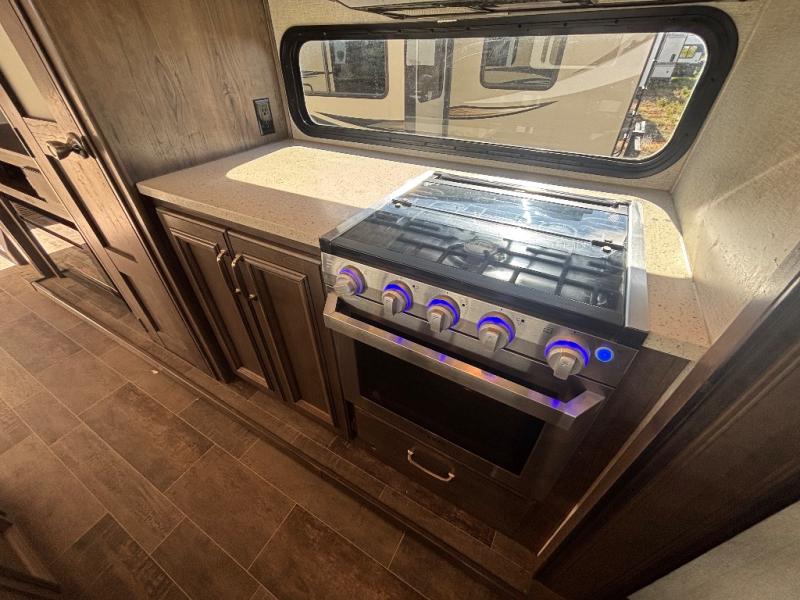 When heading out and setting up in a Keystone Montana High Country fifth wheel you will appreciate the Dexter E-Z Lube axles, Max Turn front cap and radius frame with Hitch Vision, and an enormous drop frame pass-through storage compartment to name a few features. Inside you will find luxury and comfort with the 78" tall main slide outs and flush mounted LED interior lights. The bath features a skylight over the shower, seamless countertops, and a vanity with three drawers for extra storage space!. The chef of the family is going to love the Montana High Country's kitchen with its Furrion 21" two in one stainless steel cooktop and oven, a 30" over-the-range microwave, solid surface countertops, and a high-rise faucet with an integrated pull-out sprayer, plus so much more!