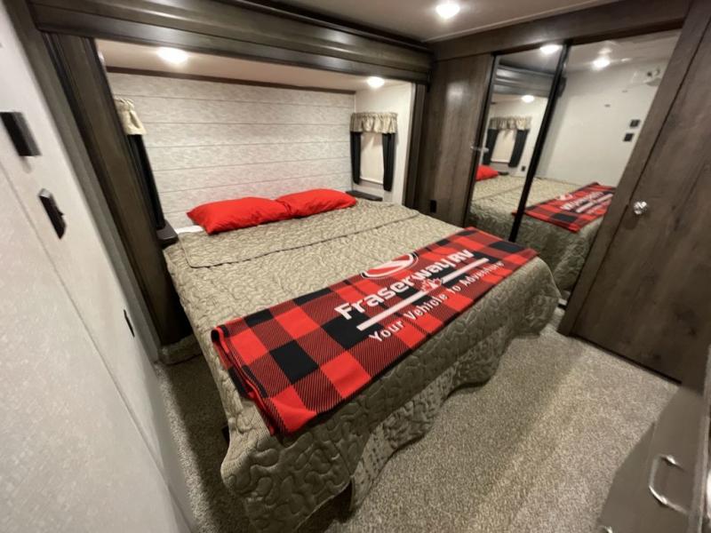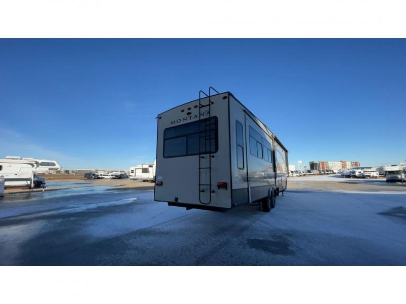 When you are ready to relax or entertain in luxury, step into this Montana High Country. Just imagine the floor space you will have with triple slide outs; two slides in the main living and kitchen area, and one slide in the front bedroom. Now imagine using the kitchen island for prepping and serving meals to your camping friends as well as washing the dishes. You will also love the usefulness of the hutch for displaying decor and storing extra dishes. Everyone can watch the big game on the HD LED TV above the LED fireplace. The front bedroom provides your own oasis with a shiplap design headboard, an HD LED TV, and a space that has been prepped for an optional washer and dryer. Outside you will find a 2" receiver hitch on the rear, exterior storage compartments, and an electric awning. Just think, you get to choose indoor or outdoor relaxation everyday!
