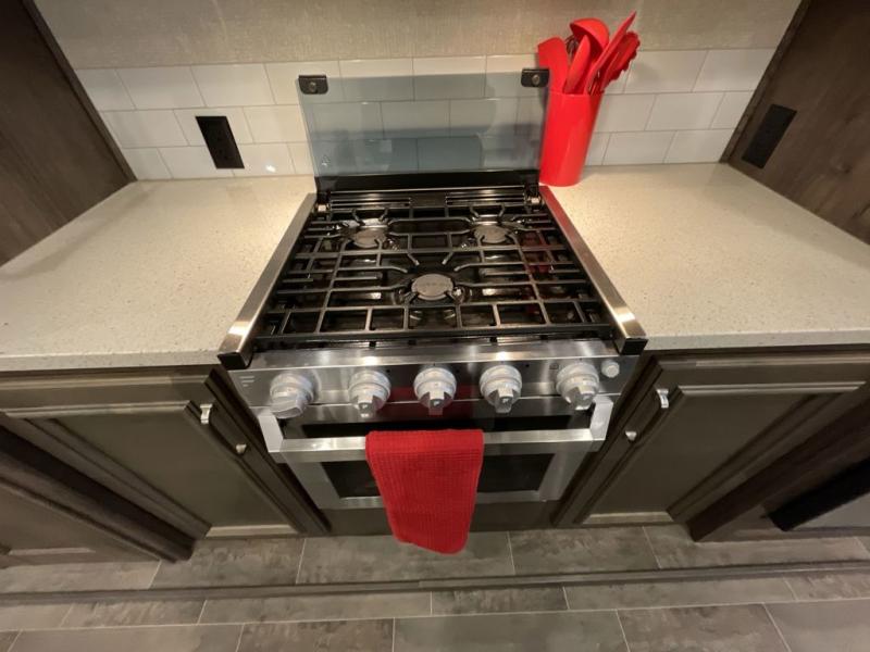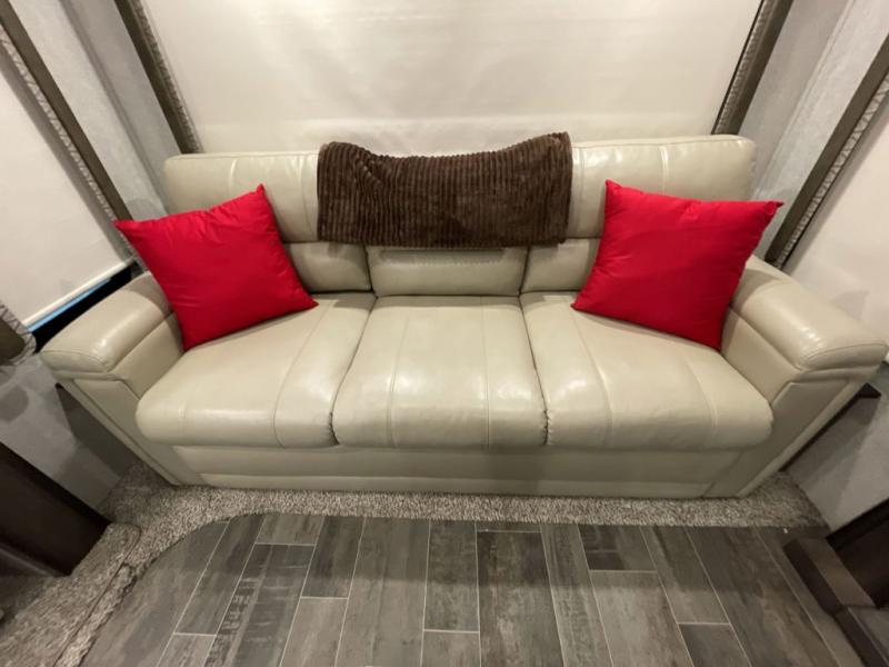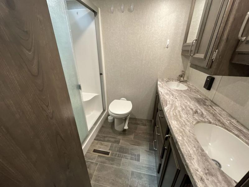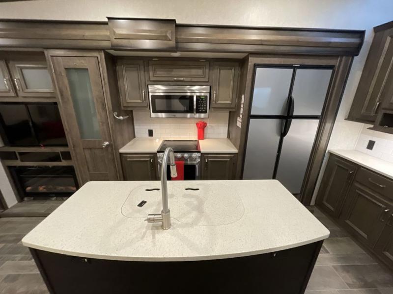 When heading out and setting up in a Keystone Montana High Country fifth wheel you will appreciate the Dexter E-Z Lube axles, Max Turn front cap and radius frame with Hitch Vision, and an enormous drop frame pass-through storage compartment to name a few features. Inside you will find luxury and comfort with the 78" tall main slide outs and flush mounted LED interior lights. The bath features a skylight over the shower, seamless countertops, and a vanity with three drawers for extra storage space!. The chef of the family is going to love the Montana High Country's kitchen with its Furrion 21" two in one stainless steel cooktop and oven, a 30" over-the-range microwave, solid surface countertops, and a high-rise faucet with an integrated pull-out sprayer, plus so much more!