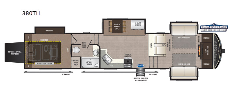 Have you been envisioning your golf cart going with you to your favorite destination? Have you been searching for the perfect fifth wheel? This Montana High Country toy hauler fifth wheel might just be the perfect answer! Model 380TH allows you to camp comfortably, and has space to take along your favorite ride on toy! Below the rear bedroom you will find a unique garage with a motion sensor LED light and a ramp door for easy loading and unloading. The front living area includes a telescoping HD LED TV above an LED fireplace, plenty of seating choices, and a front patent-pending windshield design providing amazing views. The cook will enjoy making meals in the kitchen which also includes a hutch and a 12 cu. ft. RV refrigerator. The bedroom features a shiplap design headboard, an HD LED TV, and a large wardrobe. Choose this fun RV today!
