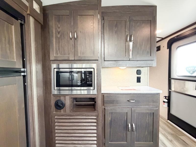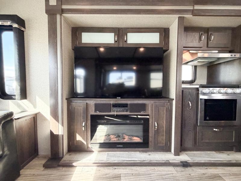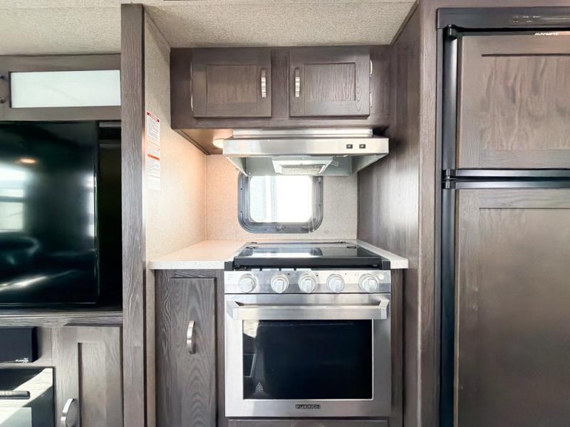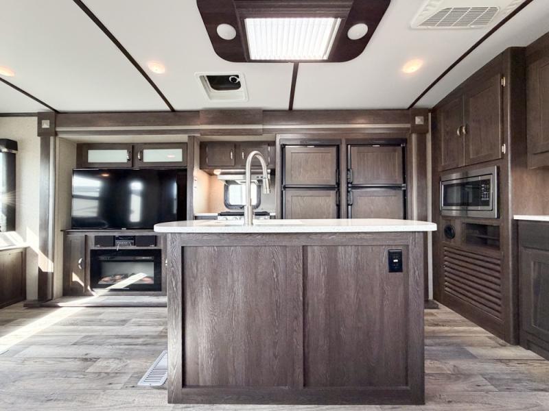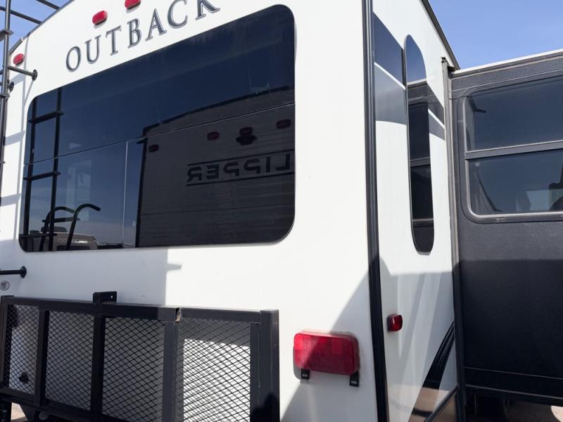 When you're ready to tour the countryside in style, choose this Outback travel trailer. From the theater seating and fireplace in the rear living area to the vaulted ceiling and large panoramic windows, you will feel the elegance from the moment you step foot into this unit. You will love spending your evenings in the private master suite because of the comfort and relaxation found in the slide-out king-size bed, and the full-wall wardrobe will easily hold all of the garments and toiletries that you have brought along with you.