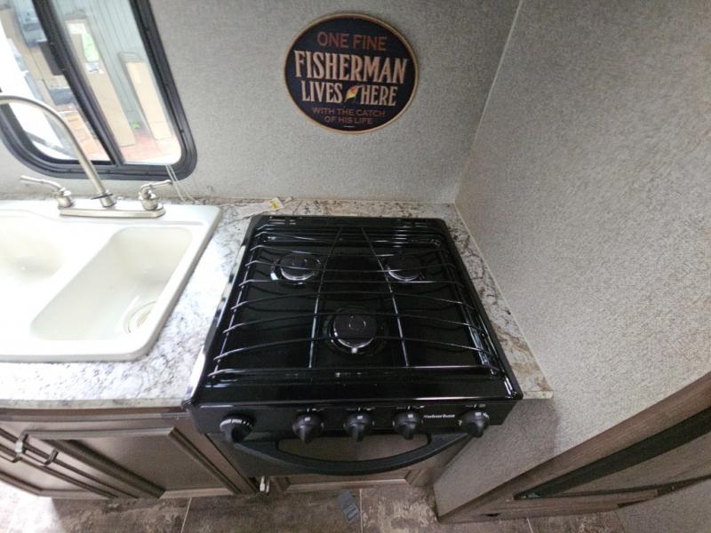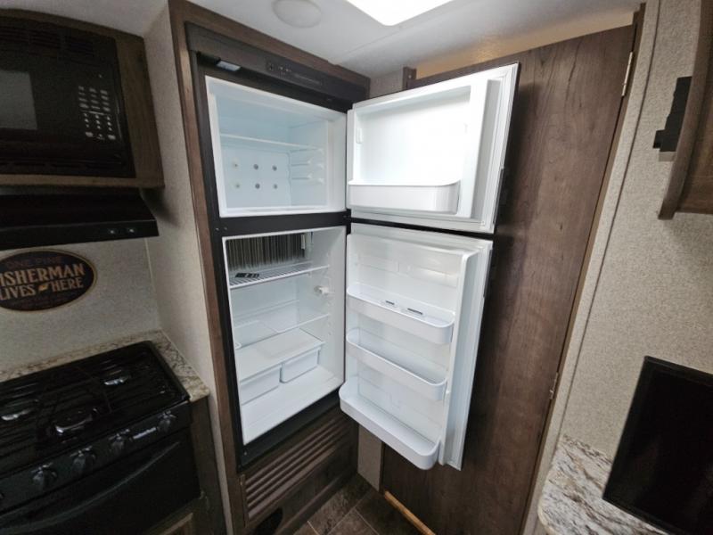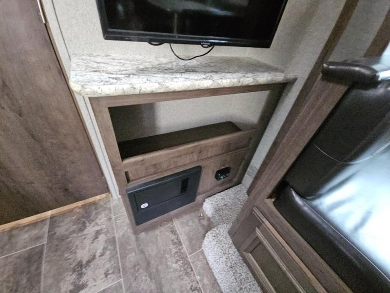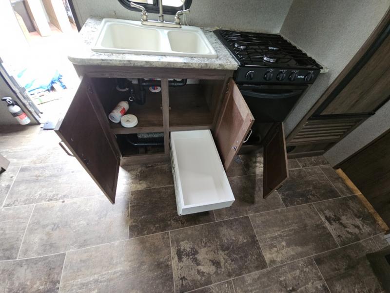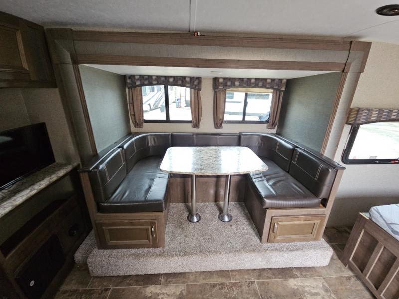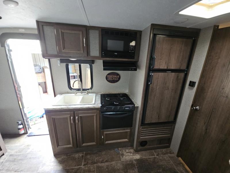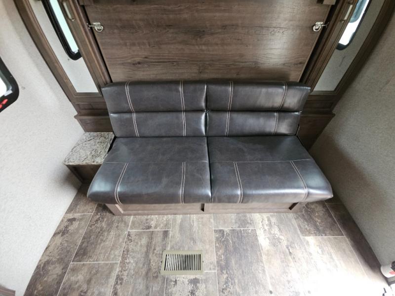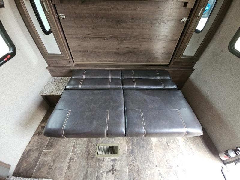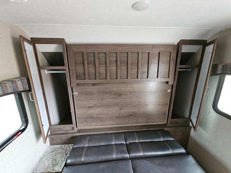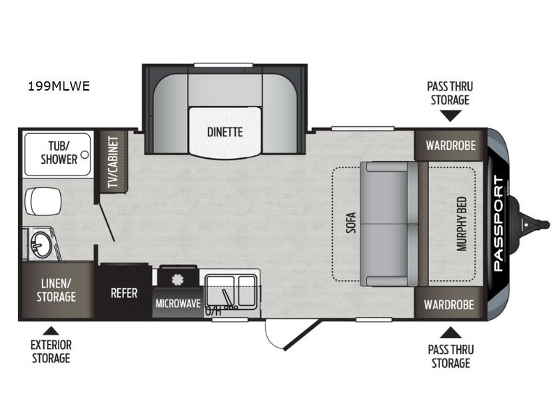 Envision relaxing on the sofa while the family plays a board game at the U-shaped dinette slide out while it's raining outside. This Passport travel trailer provides seating and sleeping arrangements for four people, plus a full bathroom. You can enjoy a front living area during the daytime, and a Murphy bed at night. No more looking at your unmade bed while camping. The full bathroom in the rear allows you to skip the public facilities and store extra clothing in the wardrobe, the kitchen amenities provide the necessary appliances to make your favorite meals, and you will find storage for all your things inside, and outside in the pass-through compartment. Comfort, relaxation, and fun are what you will get every time you take this model out.
