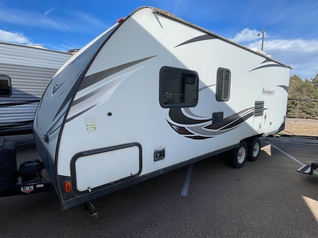 The Passport Express models come in a compact design with travel-friendly lengths that are lightweight and easy to tow behind many smaller crossover SUVs. You will find several residential style features such as durable Armstrong linoleum, furniture with high grade fabric, and raised panel hardwood cabinet doors. The exterior shower is very useful to get cleaned up before entering the RV, washing your pets, or even cleaning a few dishes outside. Choose your favorite Passport Express today, and start making memories tomorrow!