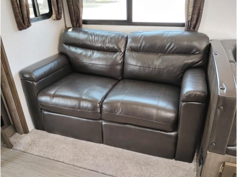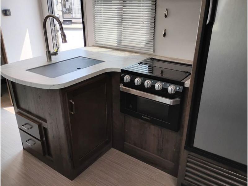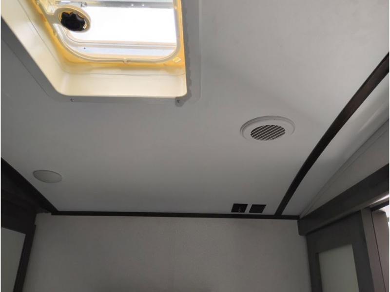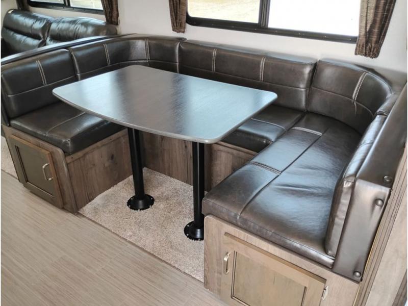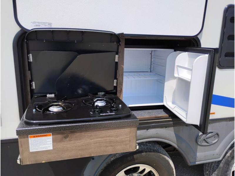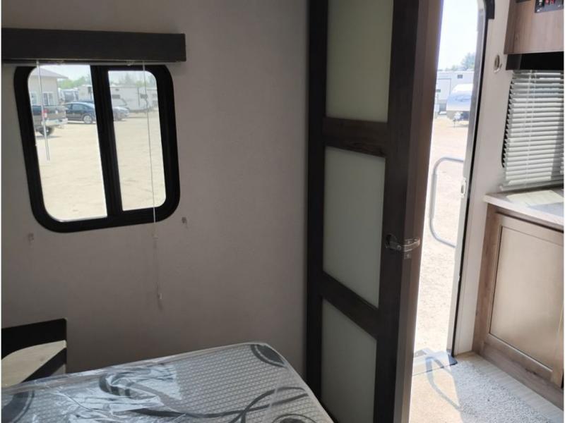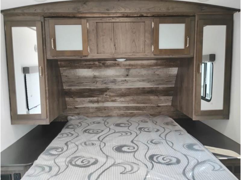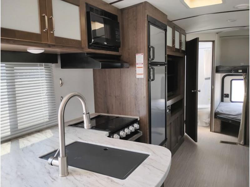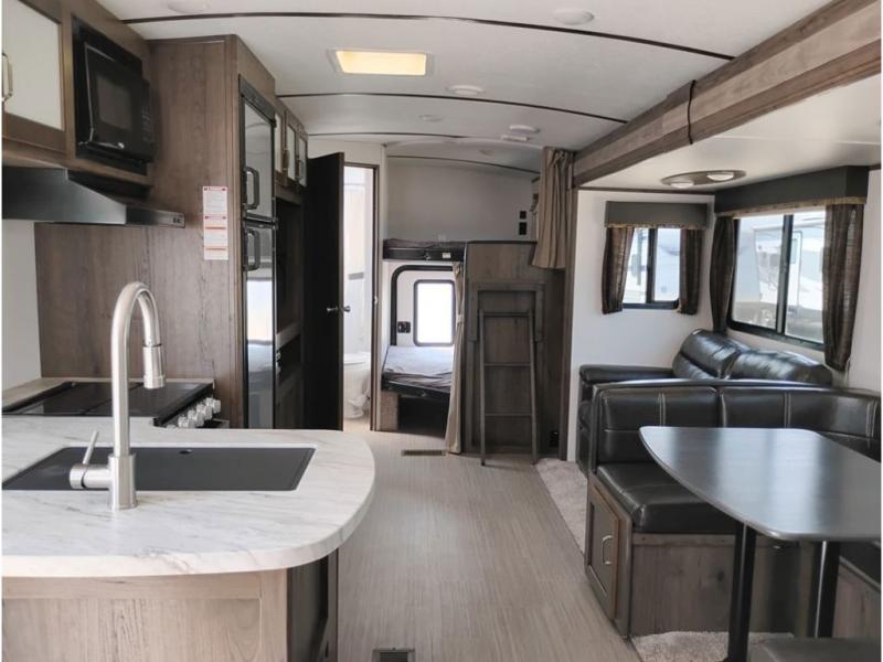 Can you envision your kids playing outside around the campsite while you cook meals on the outdoor kitchen? Your spouse will probably be sitting in a camp chair under the awning. This Passport travel trailer will be perfect for your cooking preference, your spouse's relaxing idea, and your kids' sleeping arrangements. When it's time for bedtime, you can retire to your own master bedroom up front via the main entrance, and the kids can head to their own bunk beds in the rear through the exterior bathroom entrance. The bottom bunk even flips up so you can store items when traveling down the road such as extra totes or bicycles. Storage is no issue in the kitchen, or bedroom which includes dual wardrobes. And the larger outdoor gear can be stowed away nicely in the pass-through compartment. Load up your family and start exploring today!
