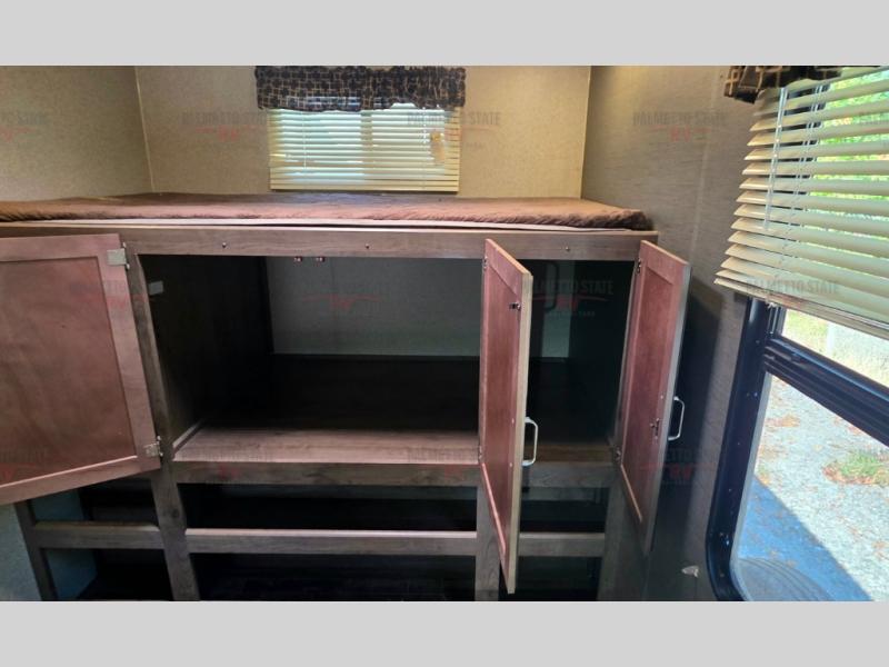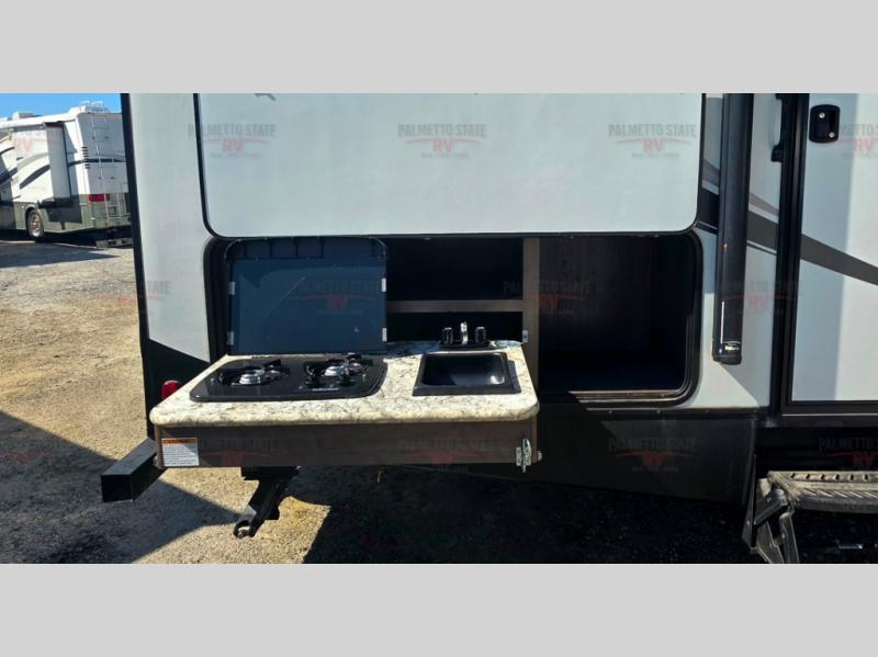A spacious bunkhouse for the kids, a bath and a half, plus an outside kitchen are the perfect features for the outdoor enthusiast and his family. You can only imagine how much fun you will have hanging out at the campfire, hiking the trails, and playing games inside on the U-shaped dinette. This Passport 3350BH Grand Touring travel trailer offers plenty of walking around room thanks to the dual slides and two exterior entry doors. The cook has the choice of making meals inside, or outside on the outdoor kitchen. The convenience center inside the main entry, the storage throughout, and the exterior pass-through compartment allows you to carry all of your gear, plus some! If you are seeking a spacious RV with plenty of sleeping space for nine to ten sleepy campers, and enjoy the convenience of your own private bathroom, step inside today.