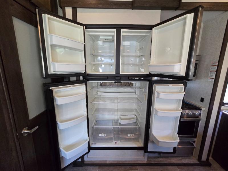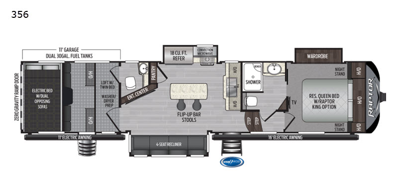 The Raptor toy hauler by Keystone has broken free from the rugged models of years past with its sharp, refined accessories and modern style, and to prove its advanced nature, the Raptor has included one of the largest refrigerators on the market into its design, an 18 cubic foot refrigerator. The Raptor is also a part of the only towable manufacturer who incorporates color-coded and numbered electrical wiring into its products, helping you save time and energy when troubleshooting electrical issues. Another best-in-the-industry component that is included with the Raptor is the 3-year limited structural warranty backed by Keystone RV which will ensure that these models truly are built for the long haul.