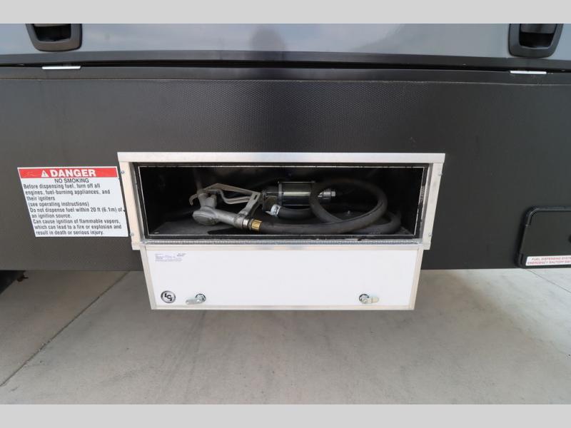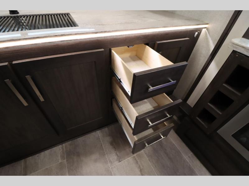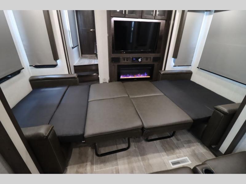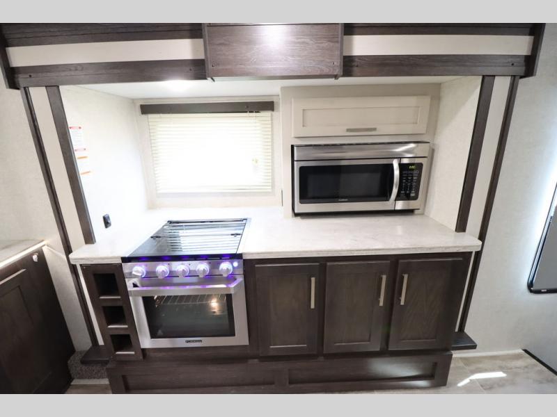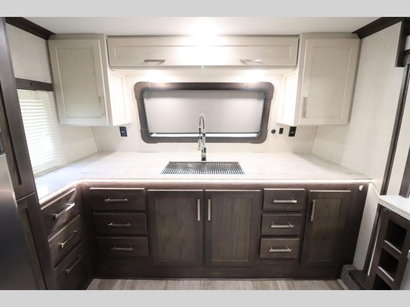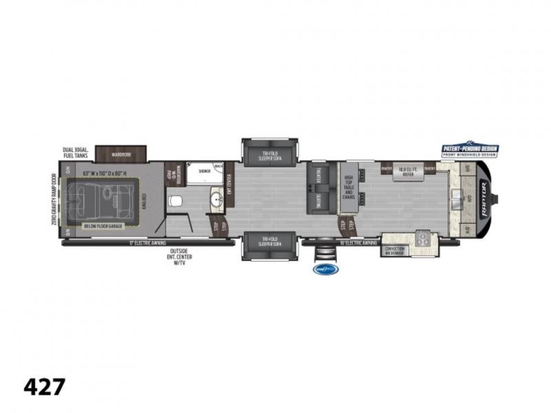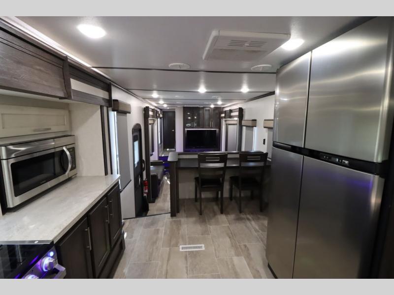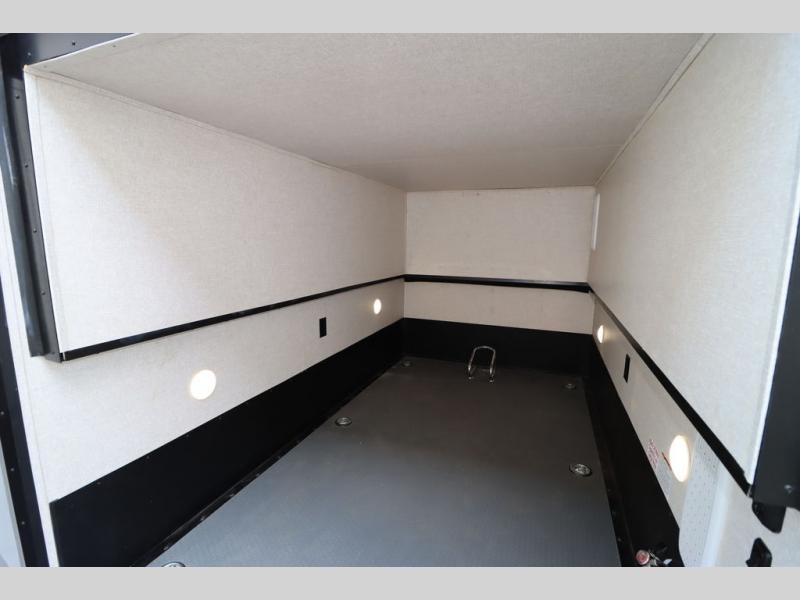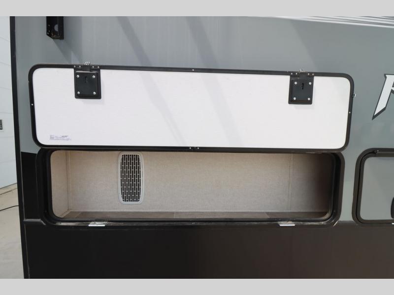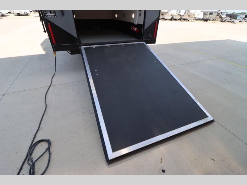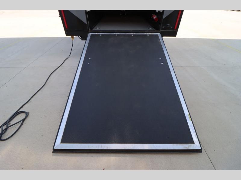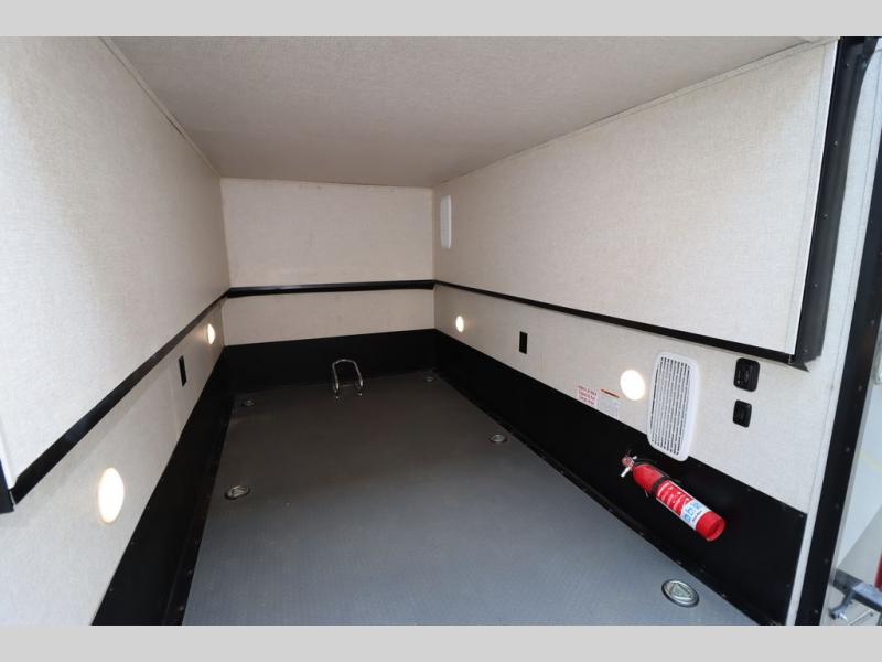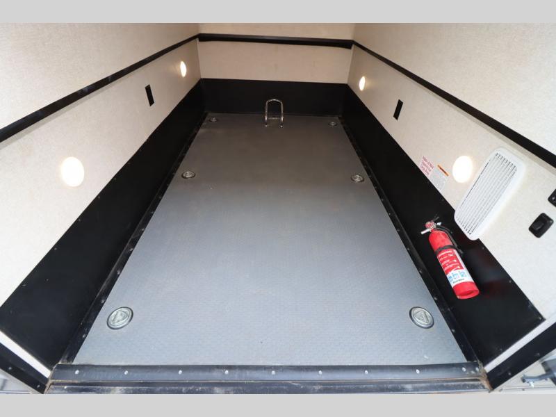 With the unique layout of this Raptor toy hauler, you will be the envy of every campground. The 9' garage that is located below the king-size bed in the private bedroom is extremely handy for storing your outdoor toys without cluttering up the interior. You will also appreciate having a central living room that feels just like home with its opposing sleeper sofa slides, theater seating, and 50" LED HDTV, and the high-top table with chairs continues the residential feel all the way up to the front kitchen where you will find extra countertop space.