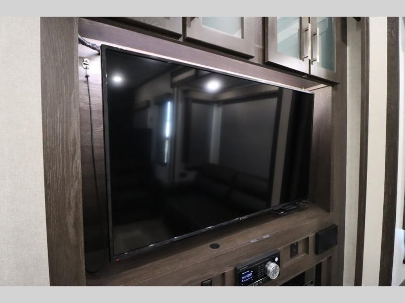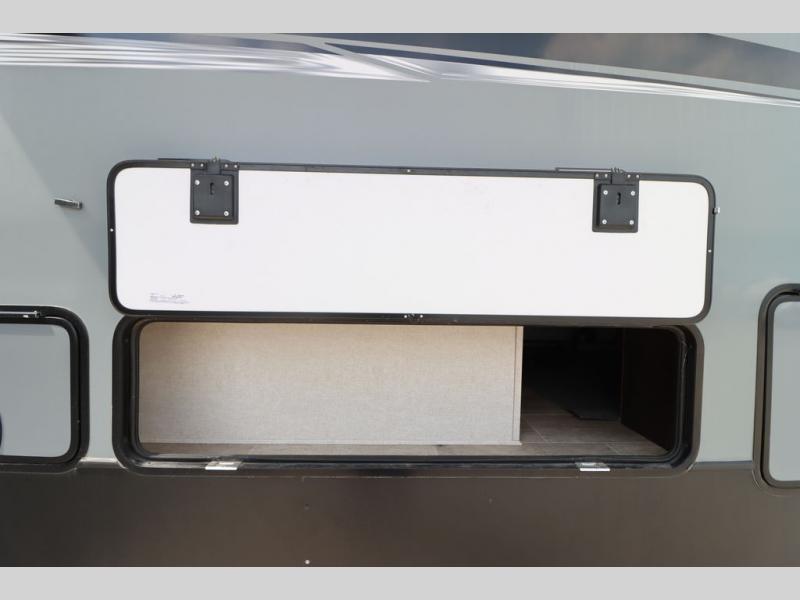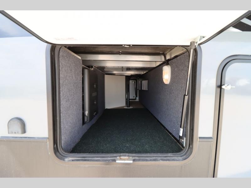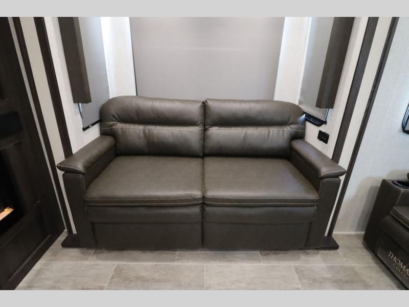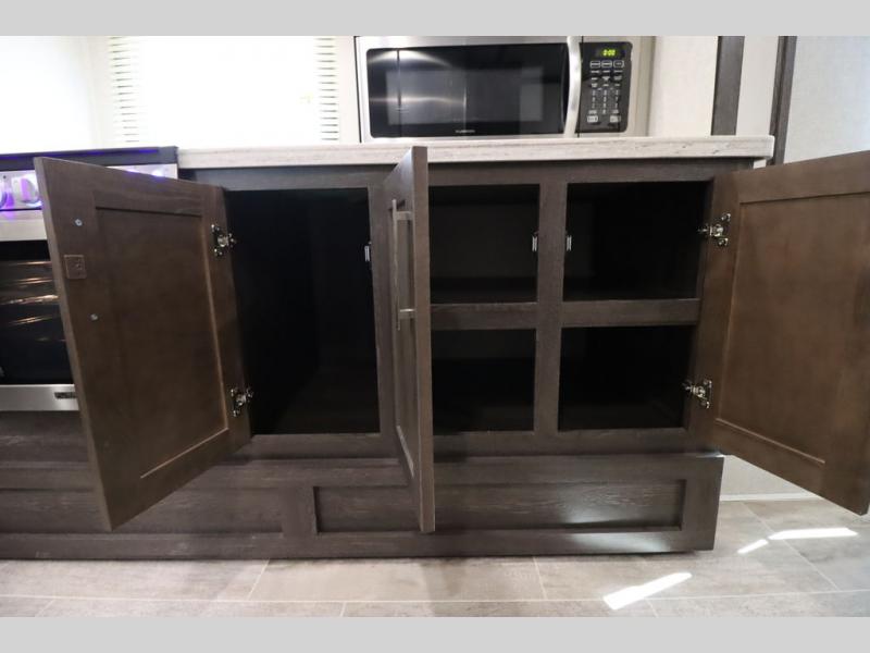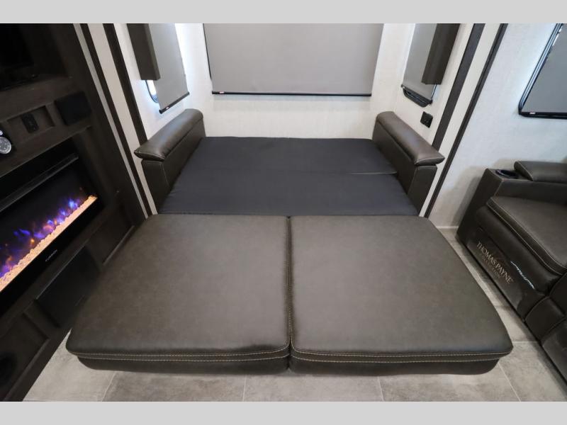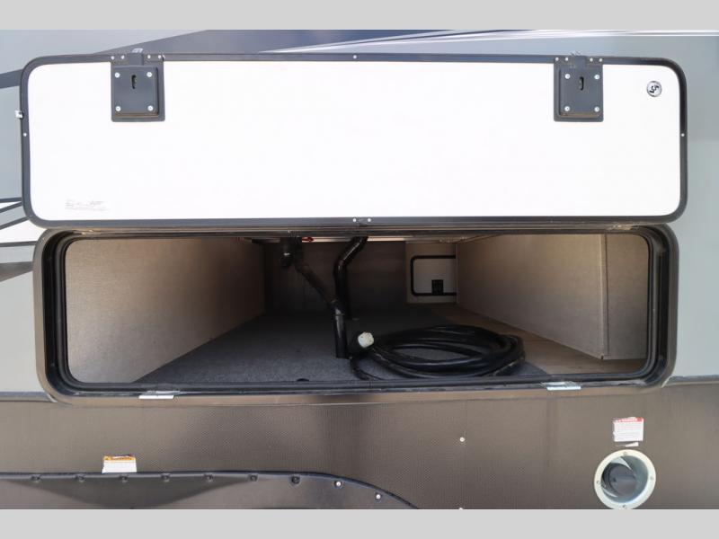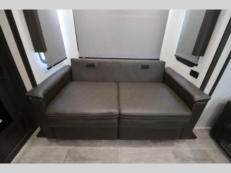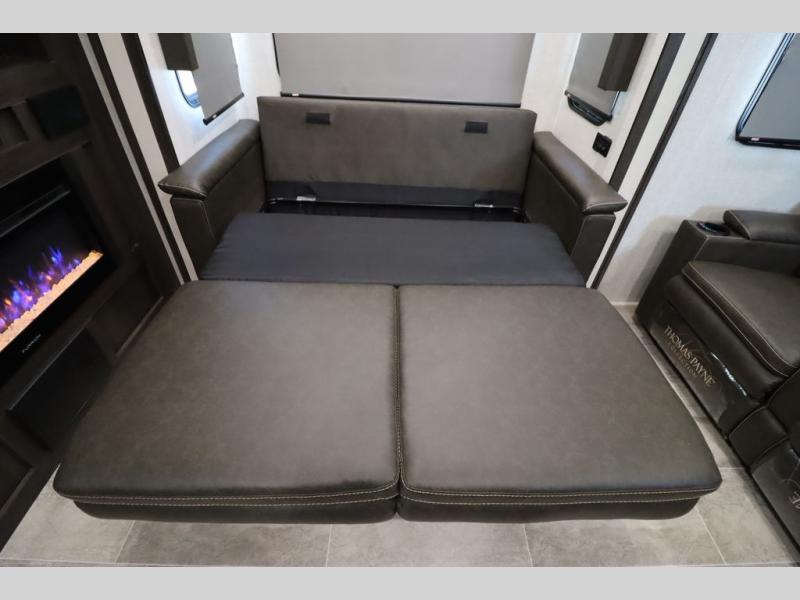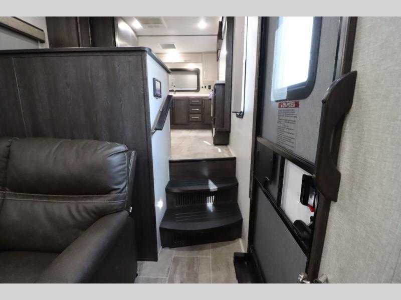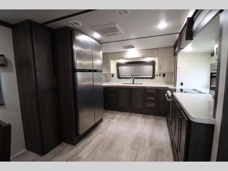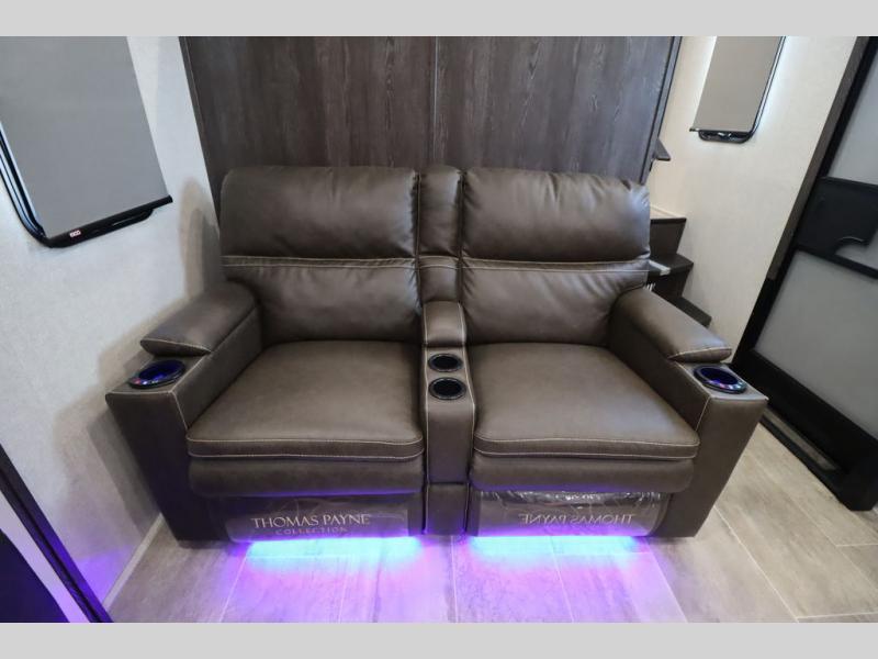 With the unique layout of this Raptor toy hauler, you will be the envy of every campground. The 9' garage that is located below the king-size bed in the private bedroom is extremely handy for storing your outdoor toys without cluttering up the interior. You will also appreciate having a central living room that feels just like home with its opposing sleeper sofa slides, theater seating, and 50" LED HDTV, and the high-top table with chairs continues the residential feel all the way up to the front kitchen where you will find extra countertop space.