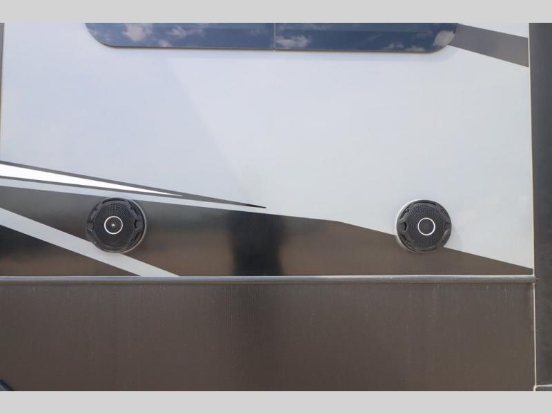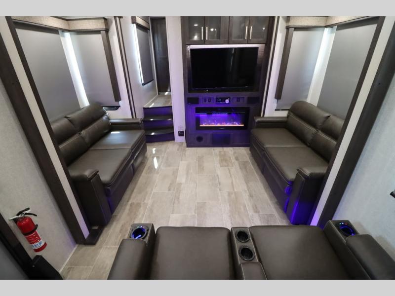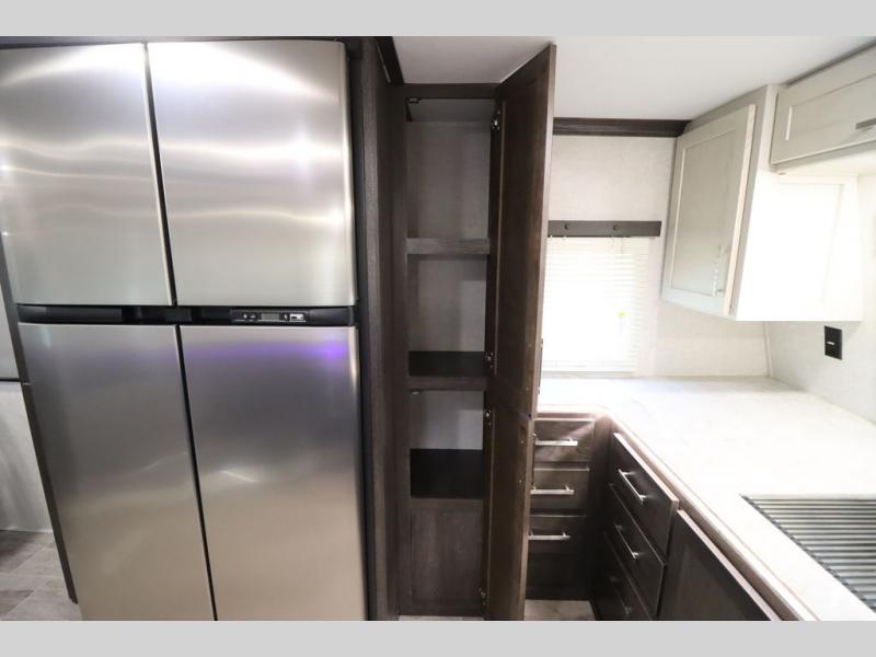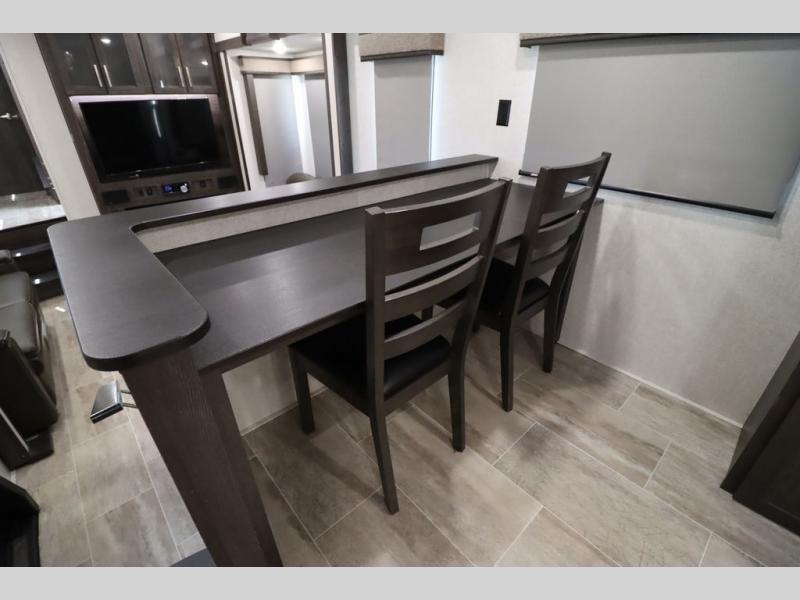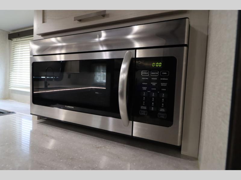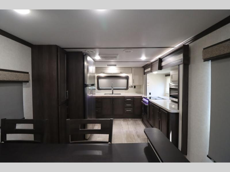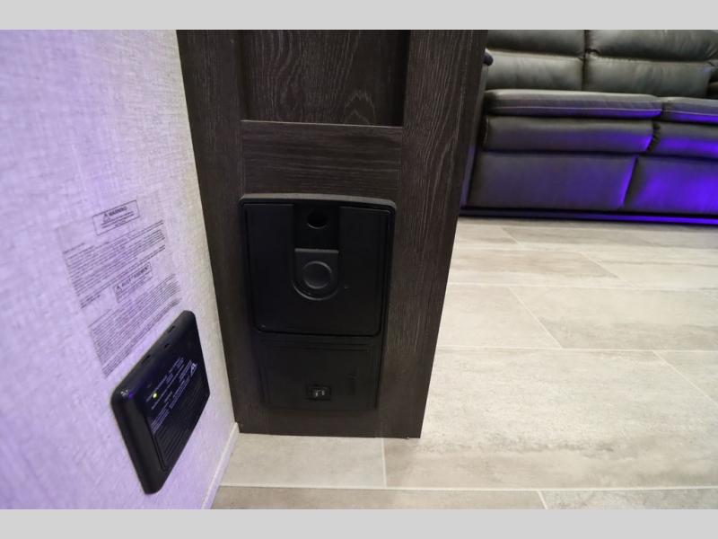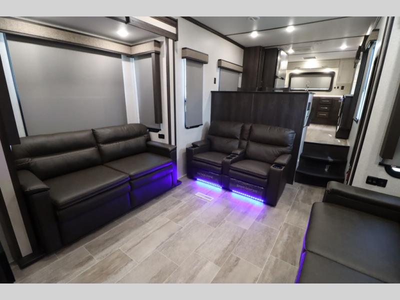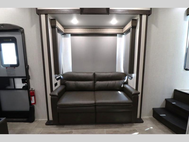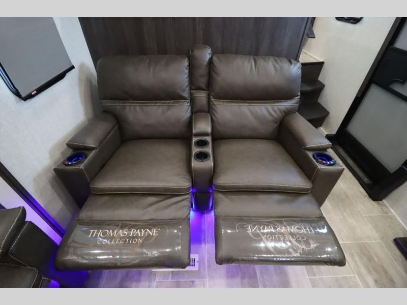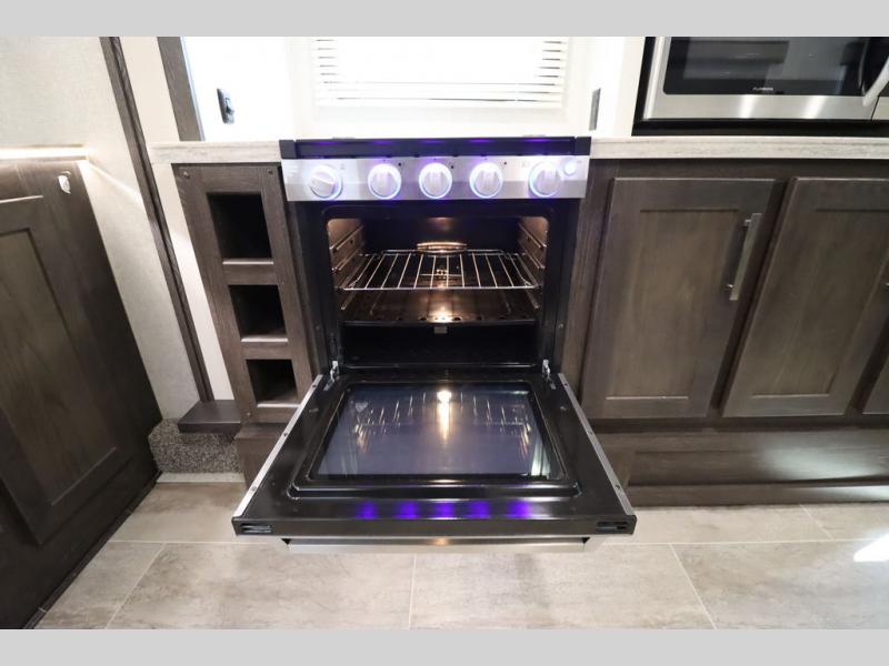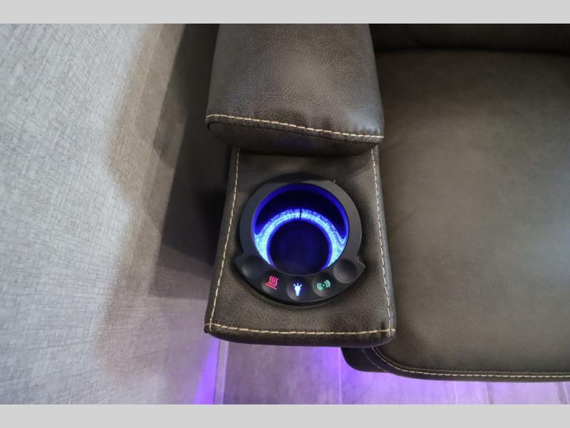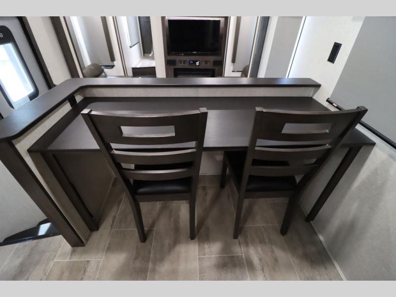 With the unique layout of this Raptor toy hauler, you will be the envy of every campground. The 9' garage that is located below the king-size bed in the private bedroom is extremely handy for storing your outdoor toys without cluttering up the interior. You will also appreciate having a central living room that feels just like home with its opposing sleeper sofa slides, theater seating, and 50" LED HDTV, and the high-top table with chairs continues the residential feel all the way up to the front kitchen where you will find extra countertop space.