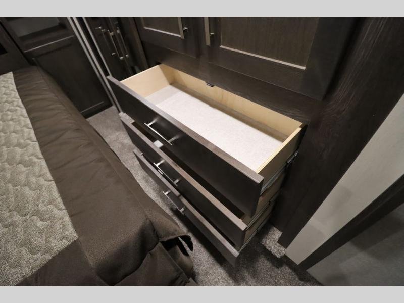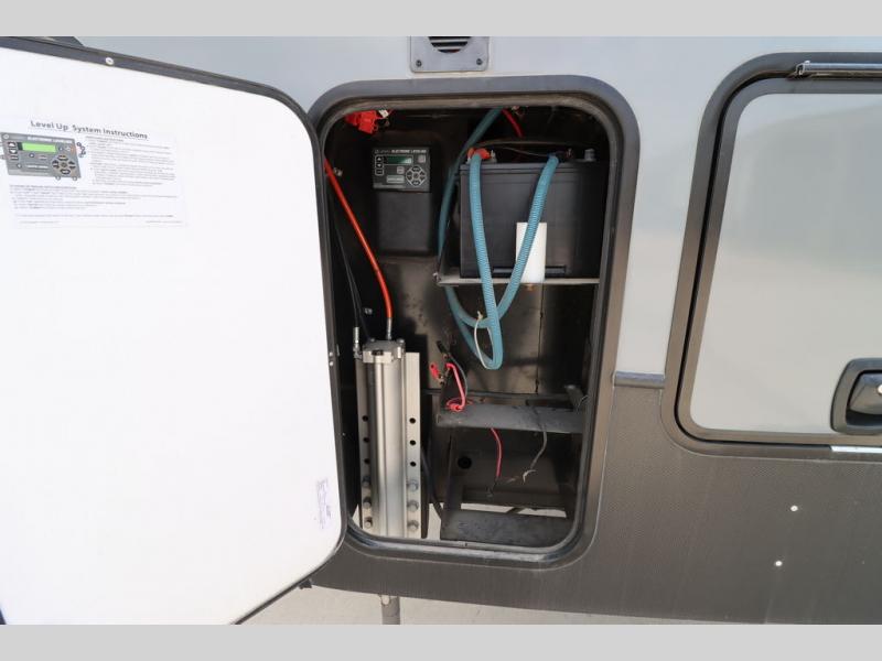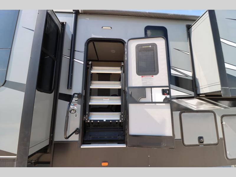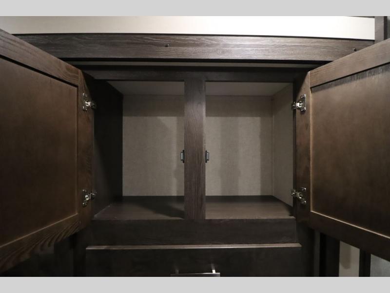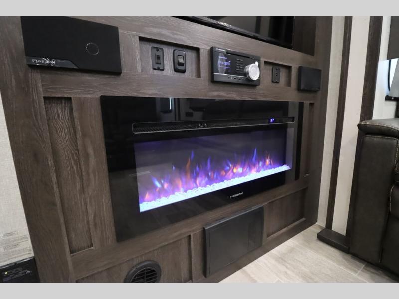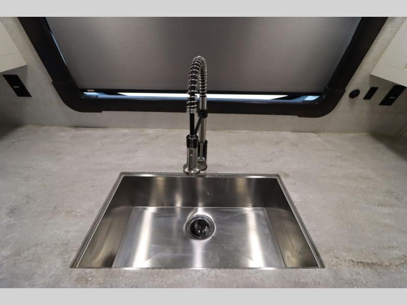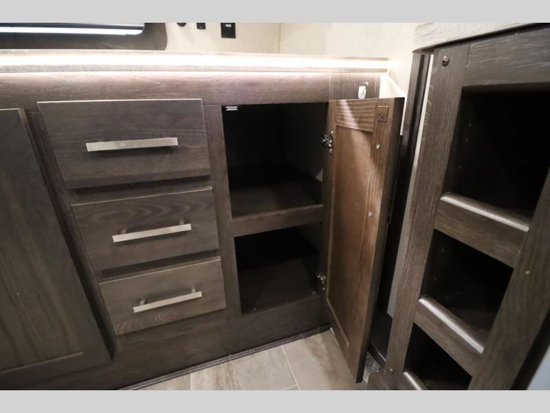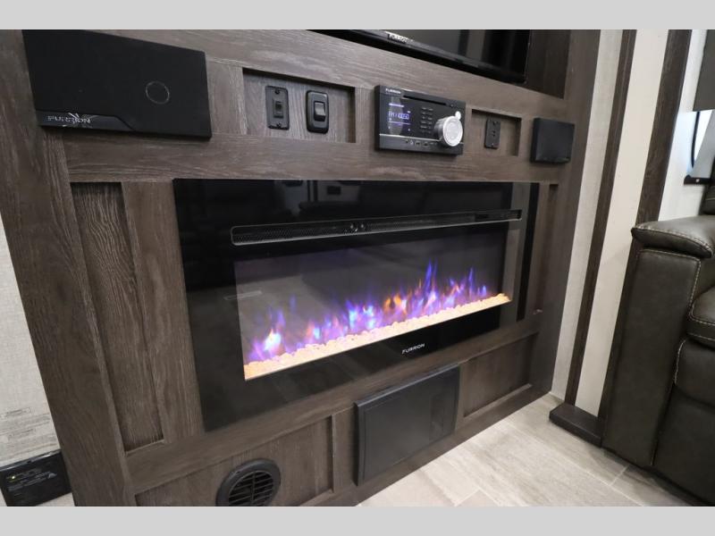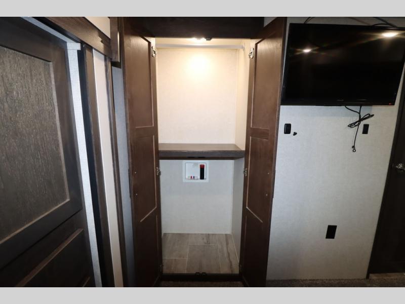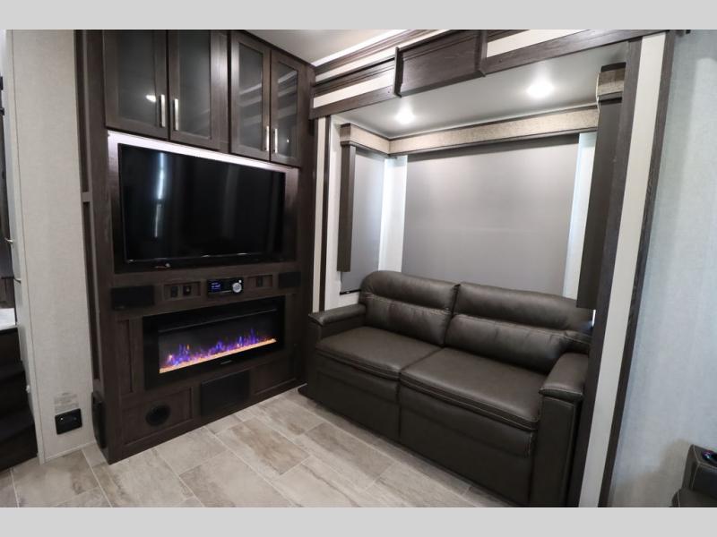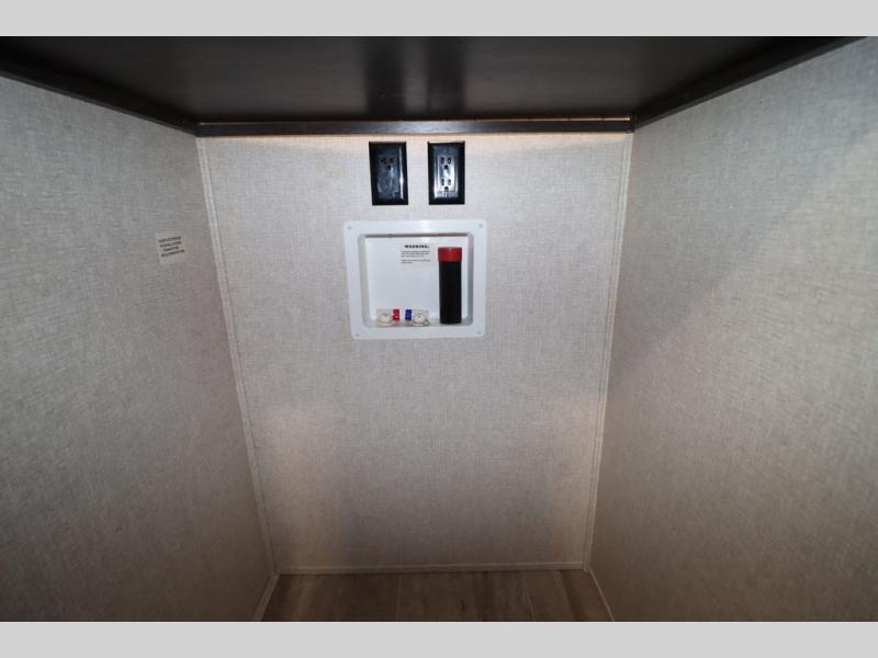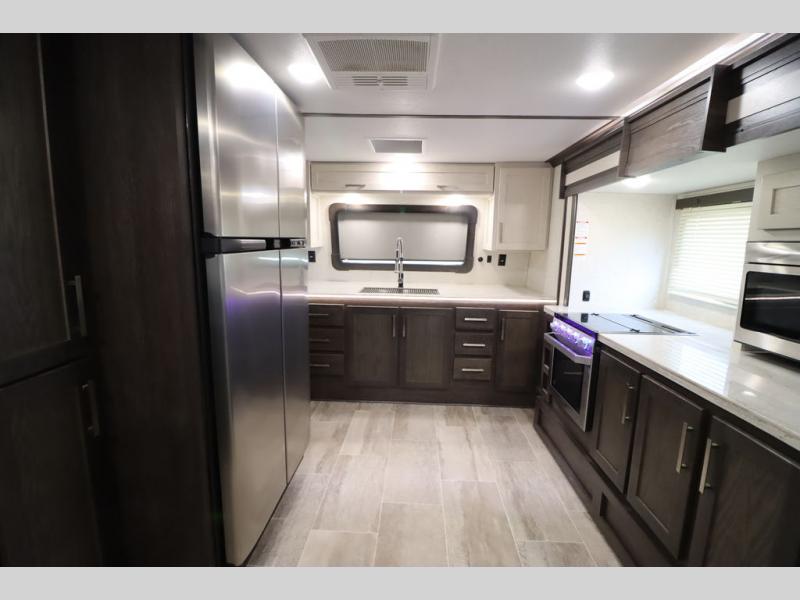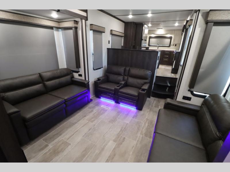 With the unique layout of this Raptor toy hauler, you will be the envy of every campground. The 9' garage that is located below the king-size bed in the private bedroom is extremely handy for storing your outdoor toys without cluttering up the interior. You will also appreciate having a central living room that feels just like home with its opposing sleeper sofa slides, theater seating, and 50" LED HDTV, and the high-top table with chairs continues the residential feel all the way up to the front kitchen where you will find extra countertop space.