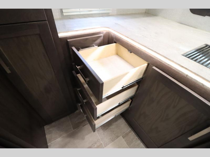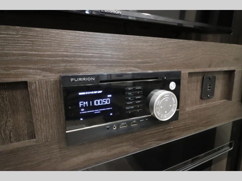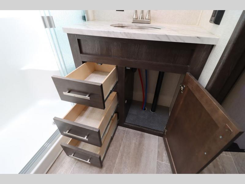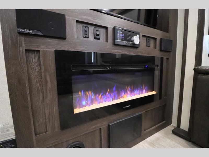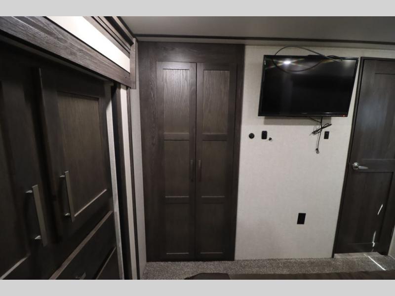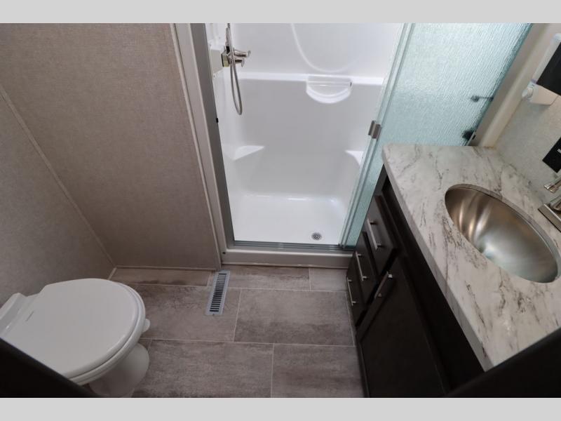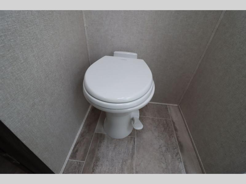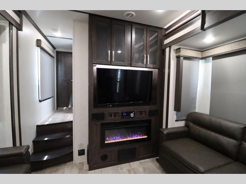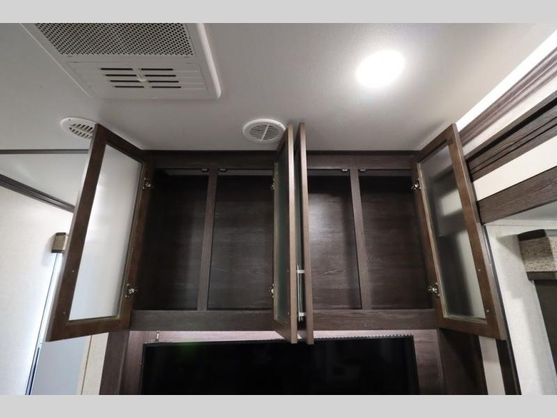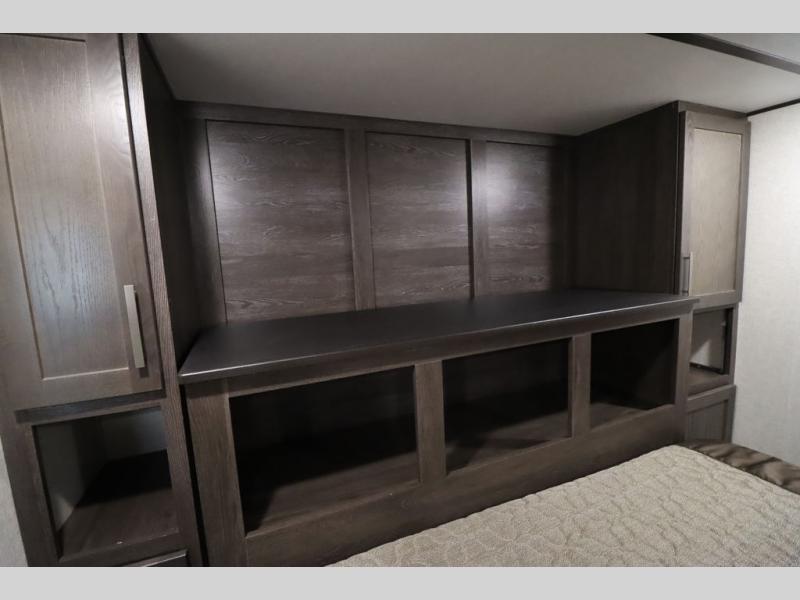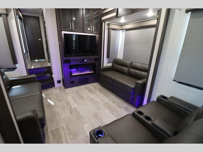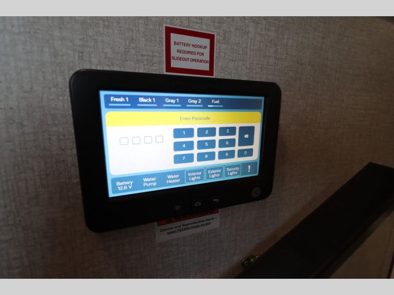 With the unique layout of this Raptor toy hauler, you will be the envy of every campground. The 9' garage that is located below the king-size bed in the private bedroom is extremely handy for storing your outdoor toys without cluttering up the interior. You will also appreciate having a central living room that feels just like home with its opposing sleeper sofa slides, theater seating, and 50" LED HDTV, and the high-top table with chairs continues the residential feel all the way up to the front kitchen where you will find extra countertop space.