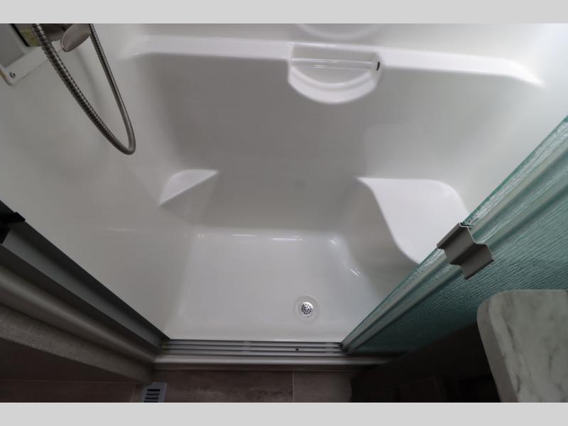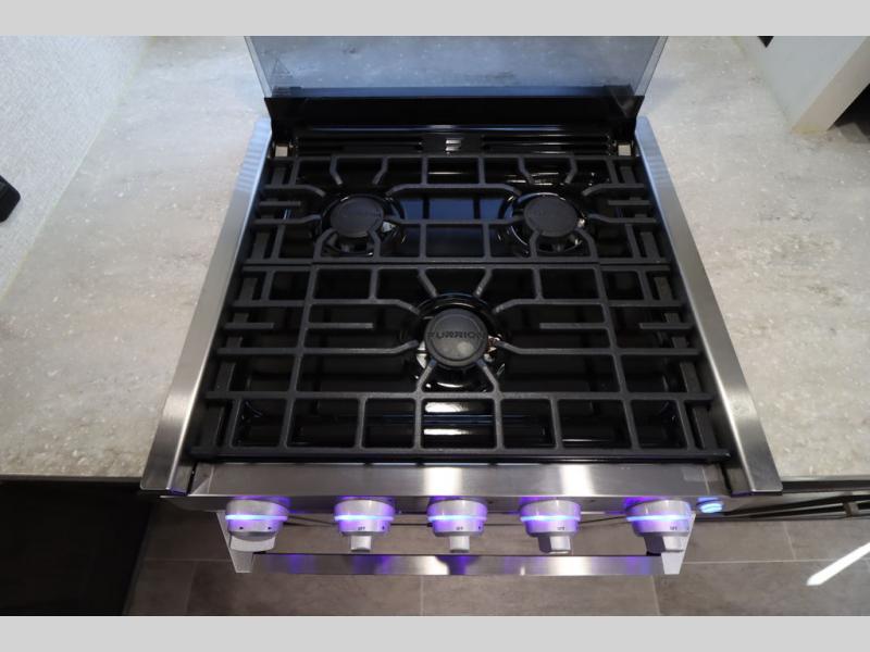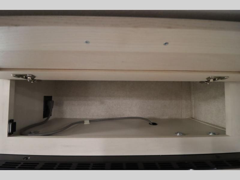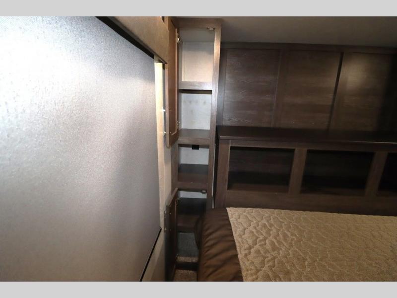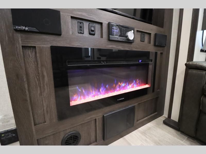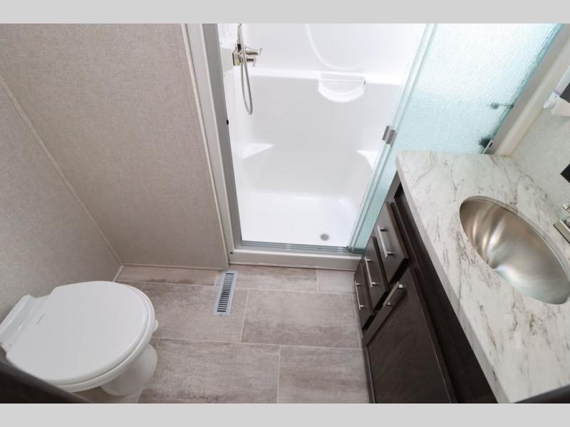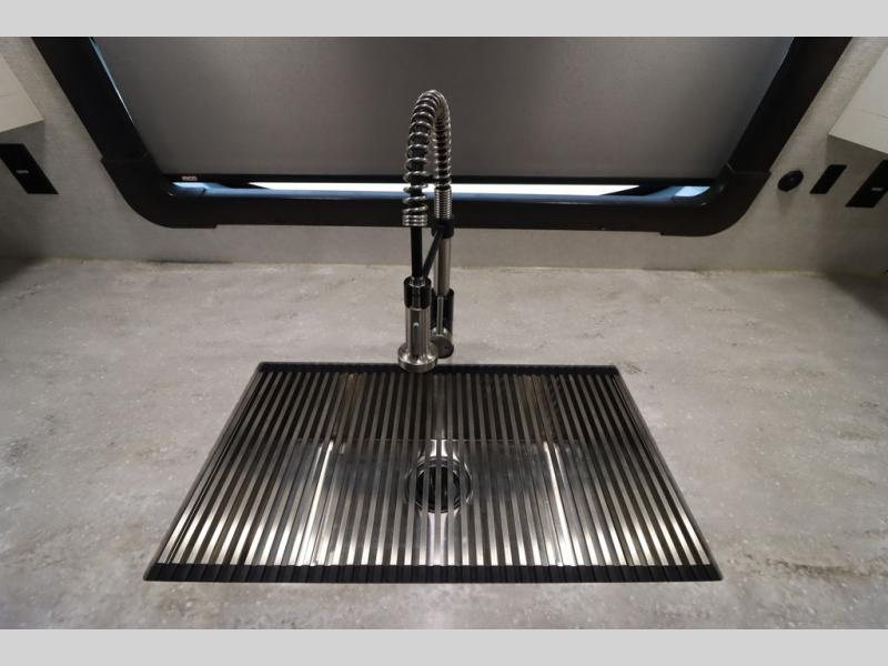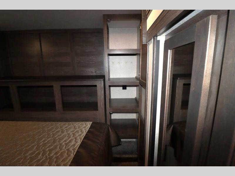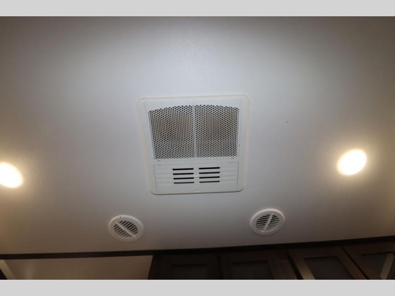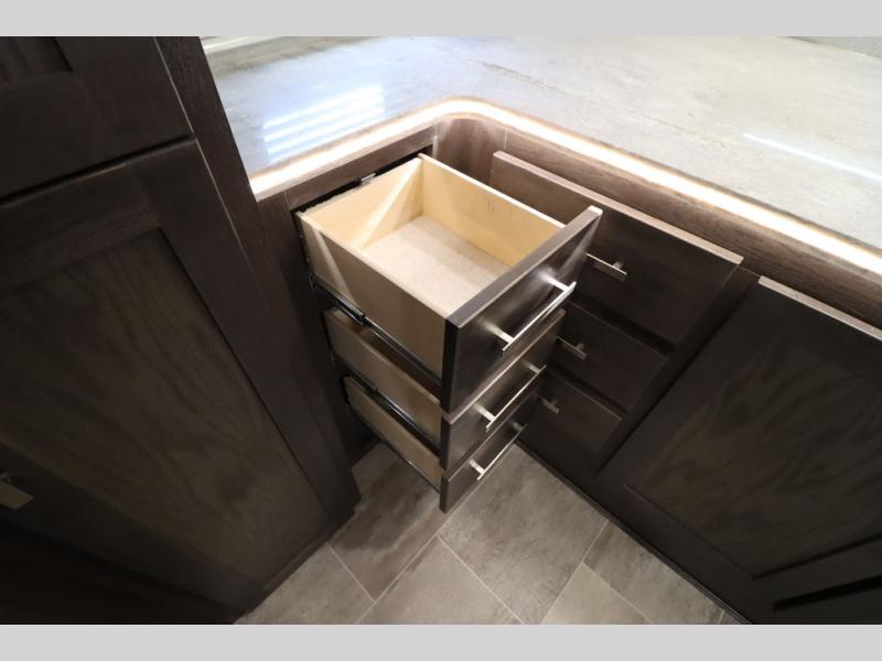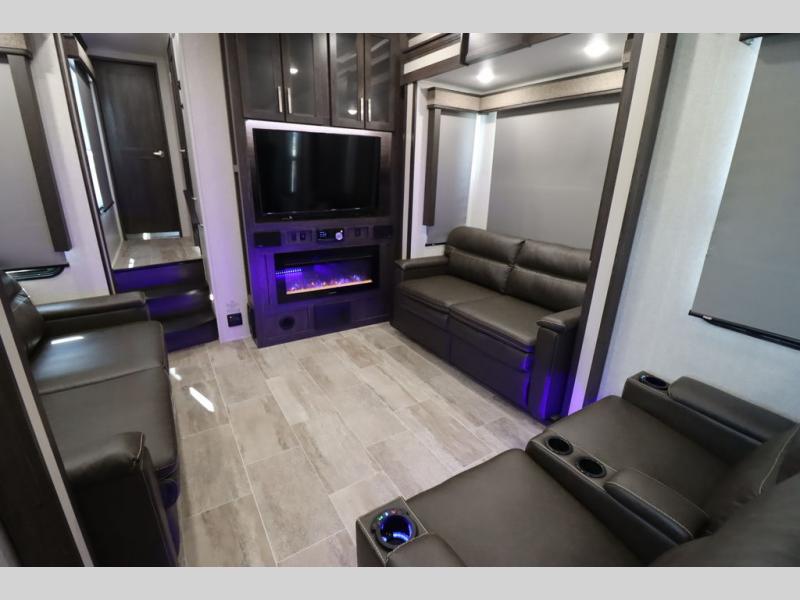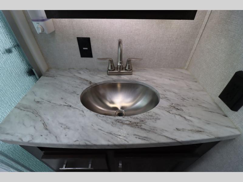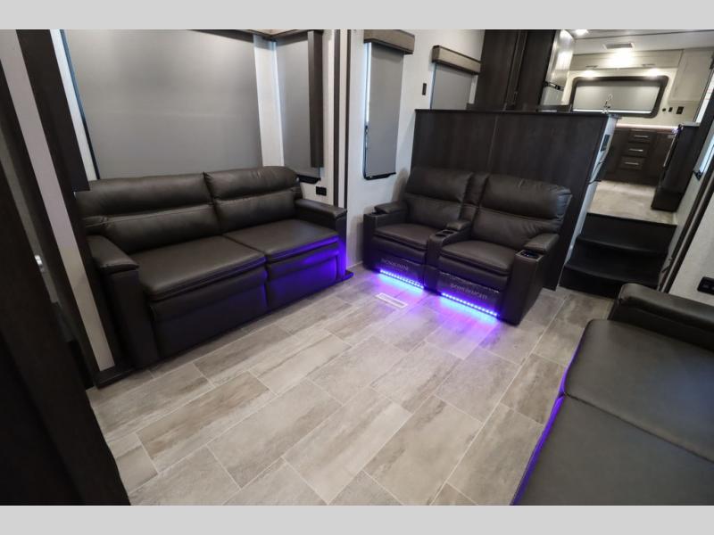 With the unique layout of this Raptor toy hauler, you will be the envy of every campground. The 9' garage that is located below the king-size bed in the private bedroom is extremely handy for storing your outdoor toys without cluttering up the interior. You will also appreciate having a central living room that feels just like home with its opposing sleeper sofa slides, theater seating, and 50" LED HDTV, and the high-top table with chairs continues the residential feel all the way up to the front kitchen where you will find extra countertop space.