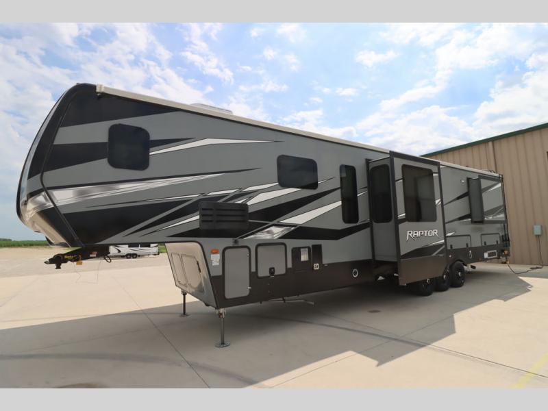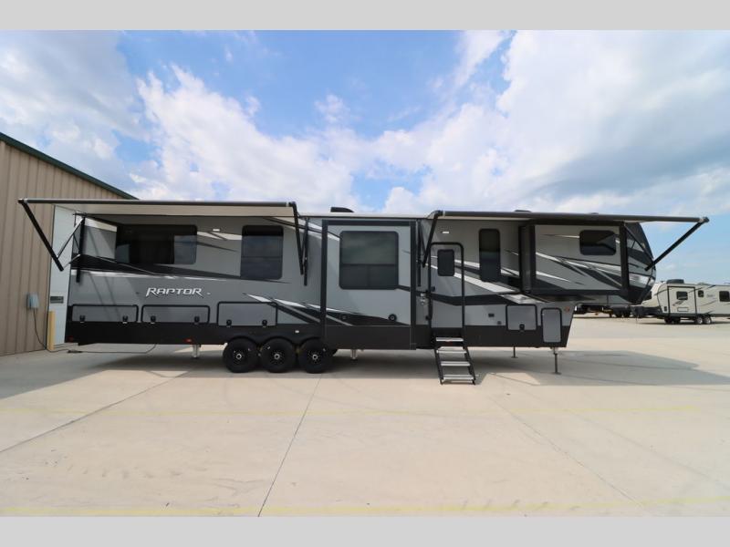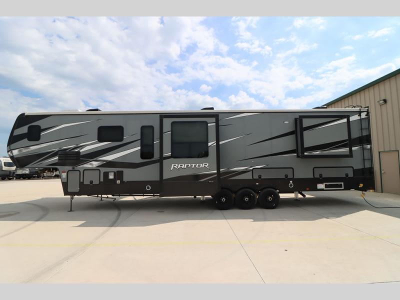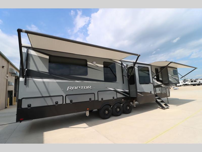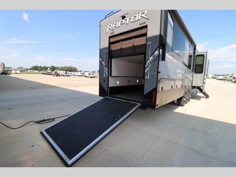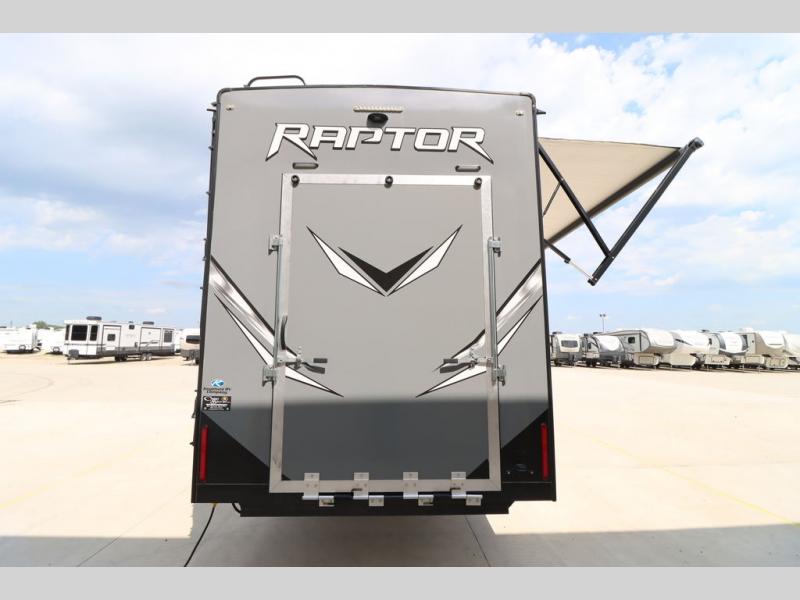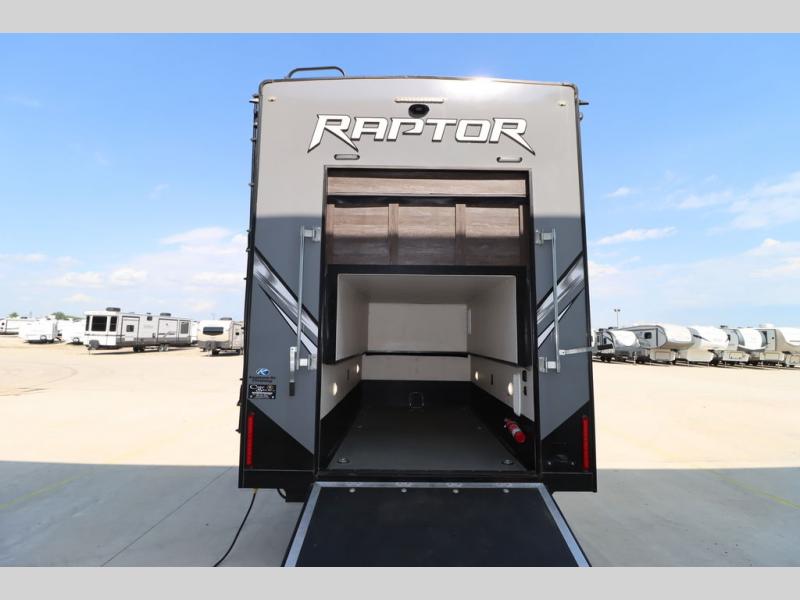 The Raptor toy hauler by Keystone has broken free from the rugged models of years past with its sharp, refined accessories and modern style, and to prove its advanced nature, the Raptor has included one of the largest refrigerators on the market into its design, an 18 cubic foot refrigerator. The Raptor is also a part of the only towable manufacturer who incorporates color-coded and numbered electrical wiring into its products, helping you save time and energy when troubleshooting electrical issues. Another best-in-the-industry component that is included with the Raptor is the 3-year limited structural warranty backed by Keystone RV which will ensure that these models truly are built for the long haul.