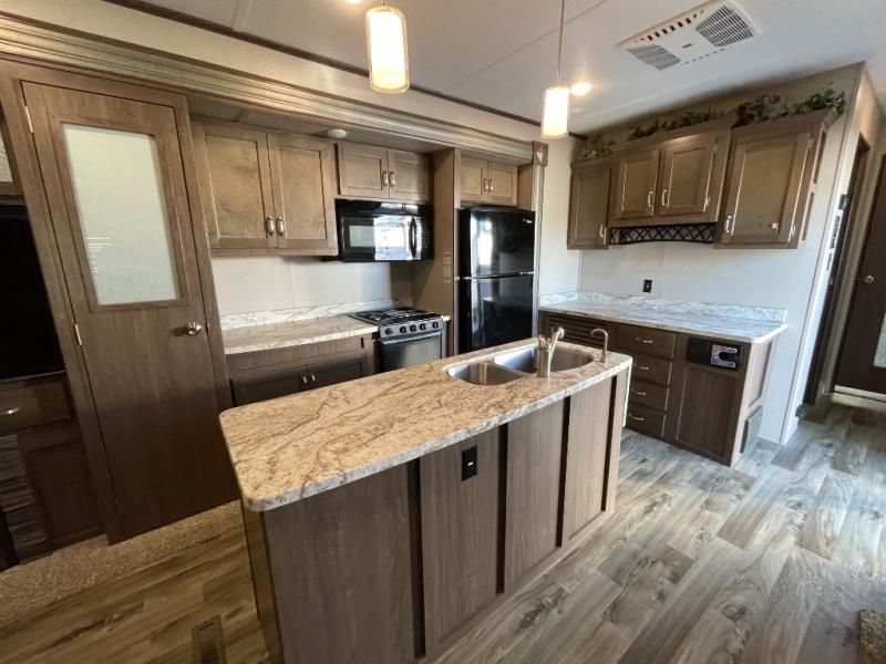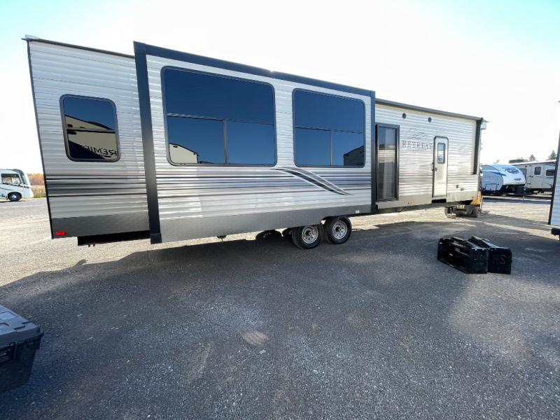 Keystone Retreat destination trailers should be your next choice when it comes to an extended stay unit. You have plenty of interior features to make it a home away from home. There are large bay windows that will add light to your unit and 8 ft. ceilings giving the space an open feel. The main living floors are Daro wrapped to keep the moisture out! The exterior is built to last with the reinforced superframe and slide out room openings. There is a black tank flush and a detachable hitch for some added convenience throughout your vacation. Come take a look at the Retreat destination trailers today!