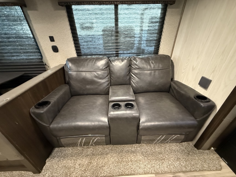 LARGE LIVING AREA WITH THEATER SEATING & TRIFOLD SLEEPER SOFA. ELECTRIC FIREPLACE & BIG FLAT SCREEN TV. BEAUTIFUL KITCHEN with residential refrigerator, STAINLESS STEEL APPLIANCES, and LOTS OF CABINET STORAGE.