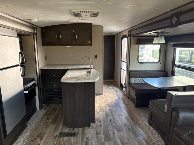 This Keystone Springdale 333RE travel trailer features three slide outs! There are two opposing slide outs in the living and kitchen area which allows for an open floor plan. There is a kitchen island with extra counter and storage space so you can prepare food and clean up easily. The theatre seating along the curbside and the sofa along the rear wall are perfect for relaxing, playing games, or chatting late into the night! The walk-through bath makes those late night trips to the bathroom more convenient. When you're ready to hit the sack, you can head into the front private bedroom and enjoy a good night's rest in the queen bed.