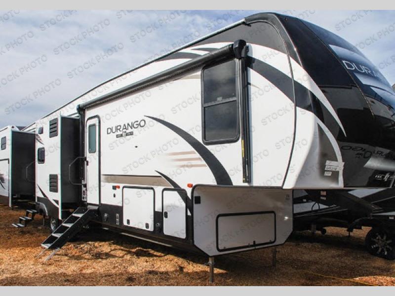 Your search is over! This Durango fifth wheel by KZ has everything on your checklist. This model features a bunkhouse with a half bath including a full wall entertainment center. The half bath has two entries, one from the bunkhouse and one from outside. There is comfortable residential-style furniture throughout including a U-shaped dinette in the living/kitchen area. You will also find a LED TV to watch, and a multiple media stereo. Don't forget about the outside kitchen including a rear bumper grill, sink, and even a refrigerator. So if you need sleeping space for 10 campers, enjoy floor space from five slide outs, and love to cook outdoors, check this model out today!