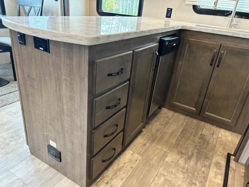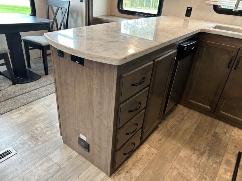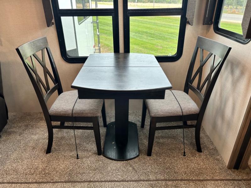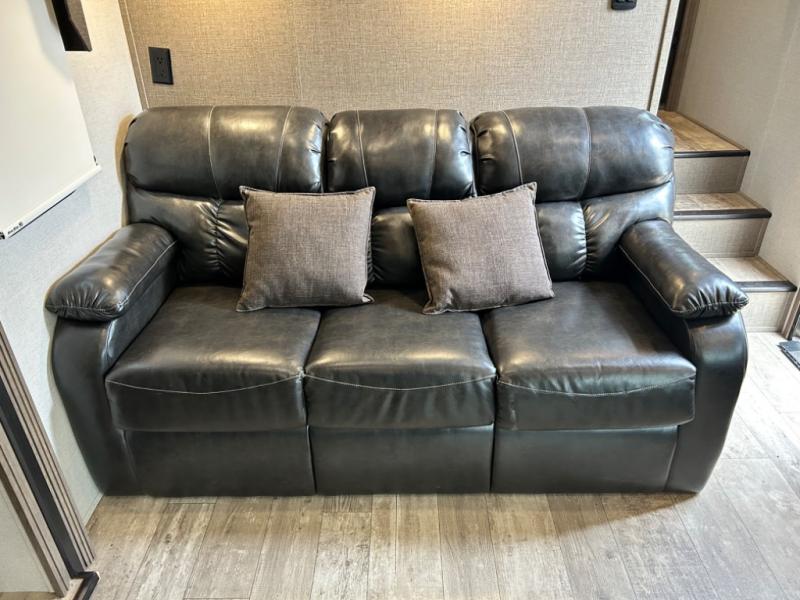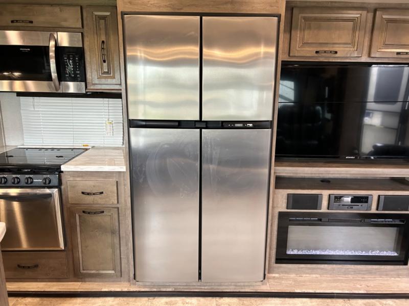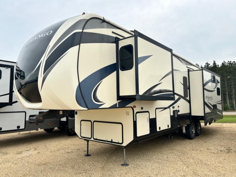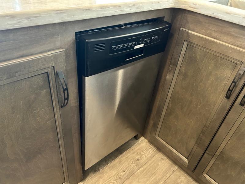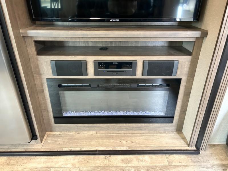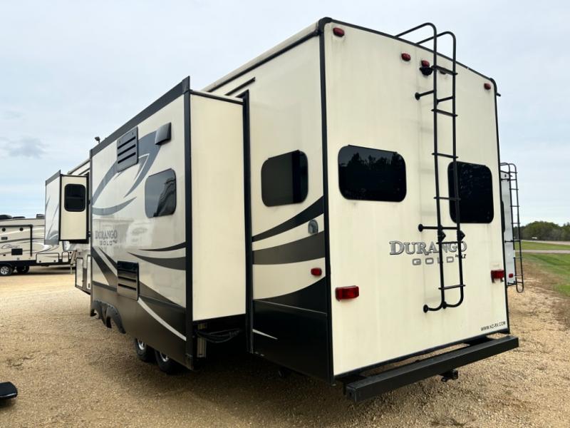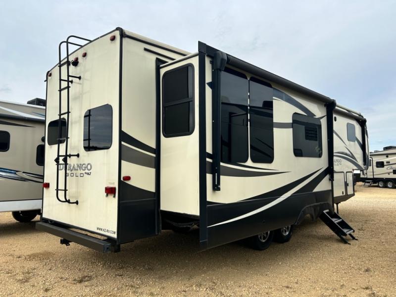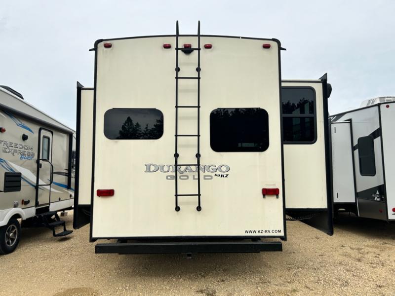 Find everything you need to enjoy your time away in your second home with this KZ Durango Gold fifth wheel! This model features three slides to give you more room to move around, a rear corner kitchen area with a dishwasher to make your cleanup a breeze, and plenty of space to relax comfortably with all of the seating. The theater seating with lighted cupholders, hide-a-bed sofa, and legless table with chairs is where you will enjoy your time whether you are eating a meal, playing games, or just talking. Grab your favorite beverage from the 18 cu. ft. gas/electric refrigerator and relax in front of the warm, cozy fireplace. You can also head outdoors with a table and chair to play a card game under the 17' electric awning with LED lights to keep the good times going even at night!