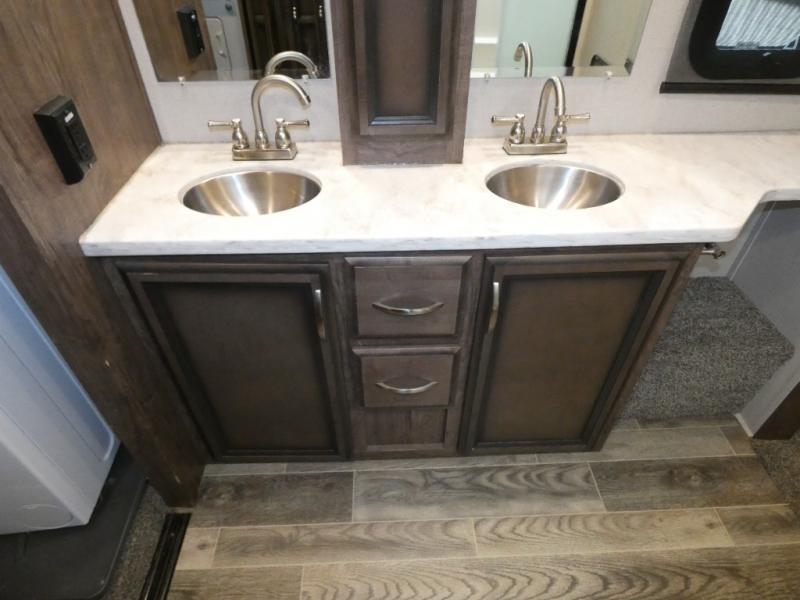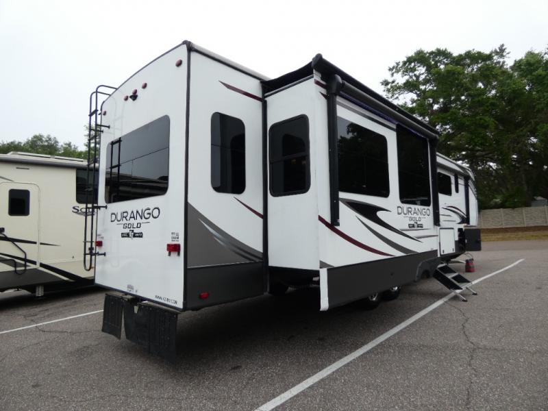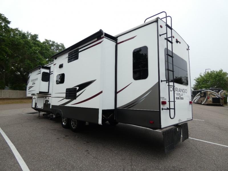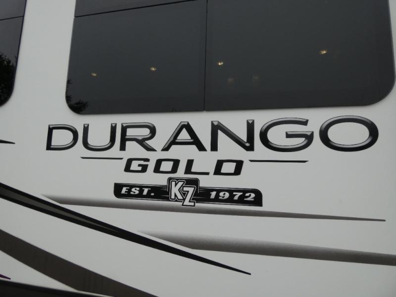 With the KZ Durango Gold fifth wheel, luxury is our name, and all-season living is our game! The Durango Gold has been built with all-weather insulation, double-insulated holding tanks, and a fully heated/enclosed underbelly. These units are also constructed with a 101" wide body, a 6-sided 100% aluminum frame, a high-gloss ivory-colored Lamilux fiberglass, and a walk-on Superflex TPO roof membrane. You also have all the comforts of home with a residential stainless steel sink, solid surface countertops, maple-glazed cabinetry, and a power vent fan.