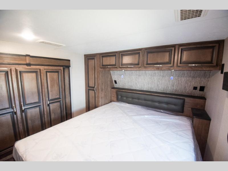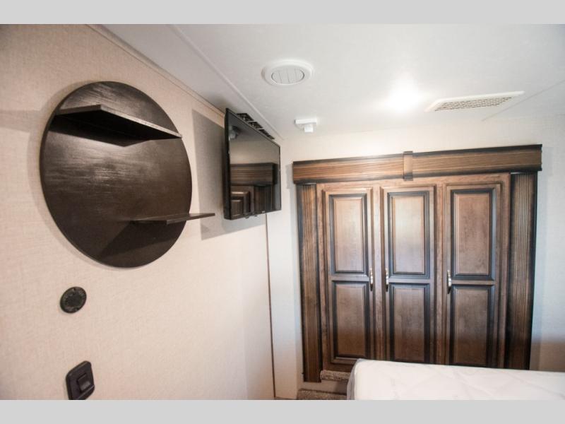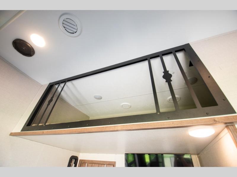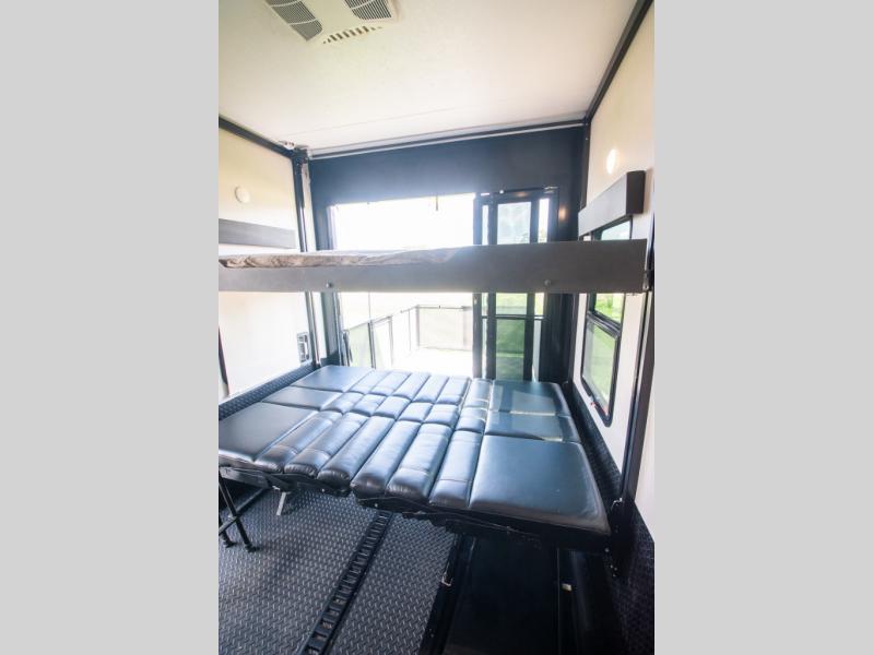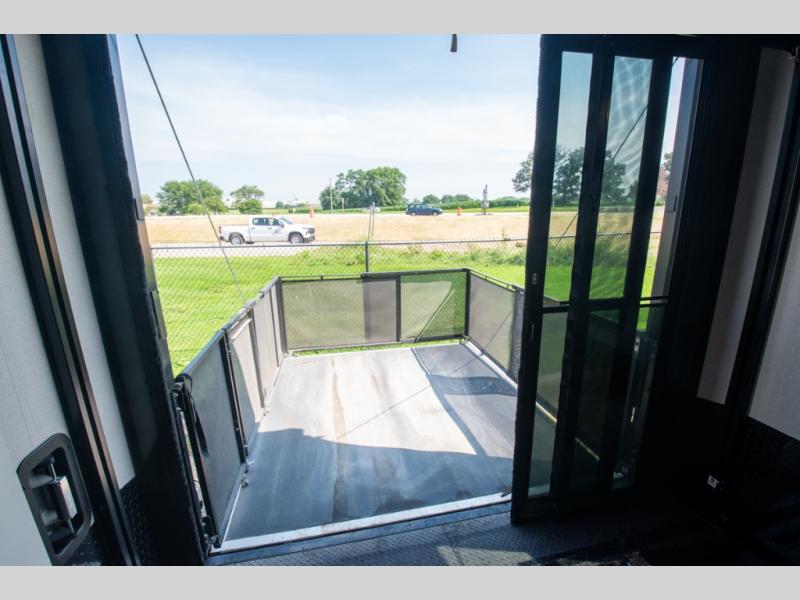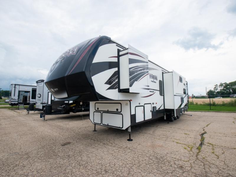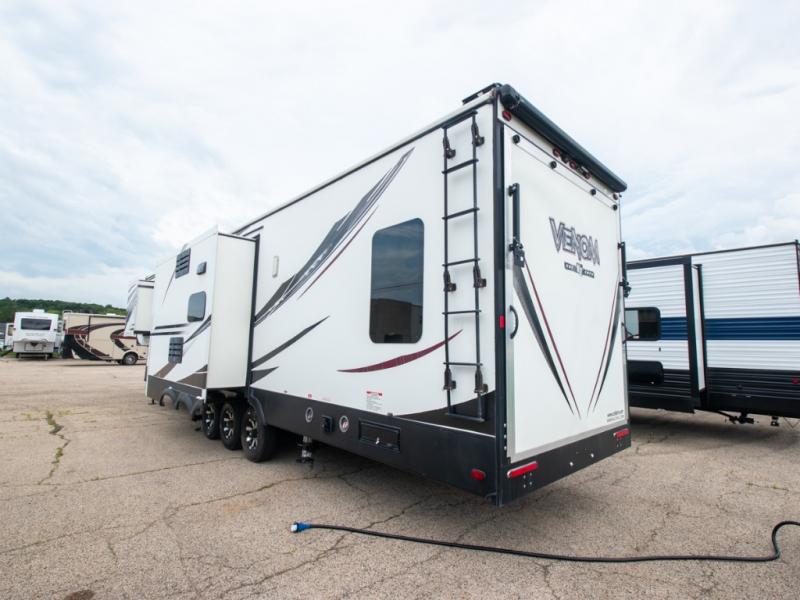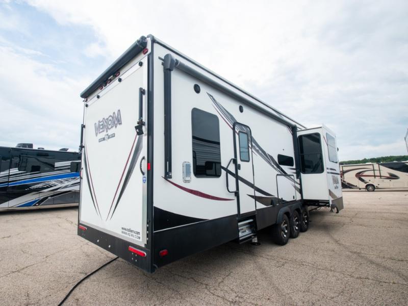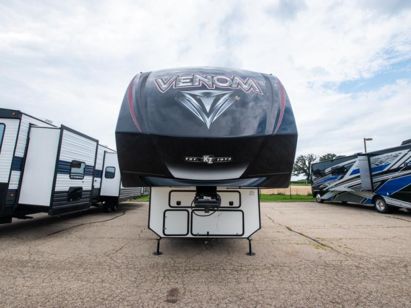 When you choose to camp with a KZ Venom toy hauler fifth wheel you are choosing upscale features and luxury throughout. You will find a 7" monitor MyRV OneTouch control panel with downloadable app which monitors tank and battery levels, controls slide rooms, leveling system, awnings, plus inside and outside lighting. In the garage there is a roll-down screen wall allowing the fresh air to flow in and out, a Zero Gravity ramp door with easy lift assist, plus an E-Track tie-down system allowing you to secure your load quickly. And the interior offers a chef's appliance package, and comfortable bedroom accommodations, plus more! Come select your Venom luxury toy hauler fifth wheel today!